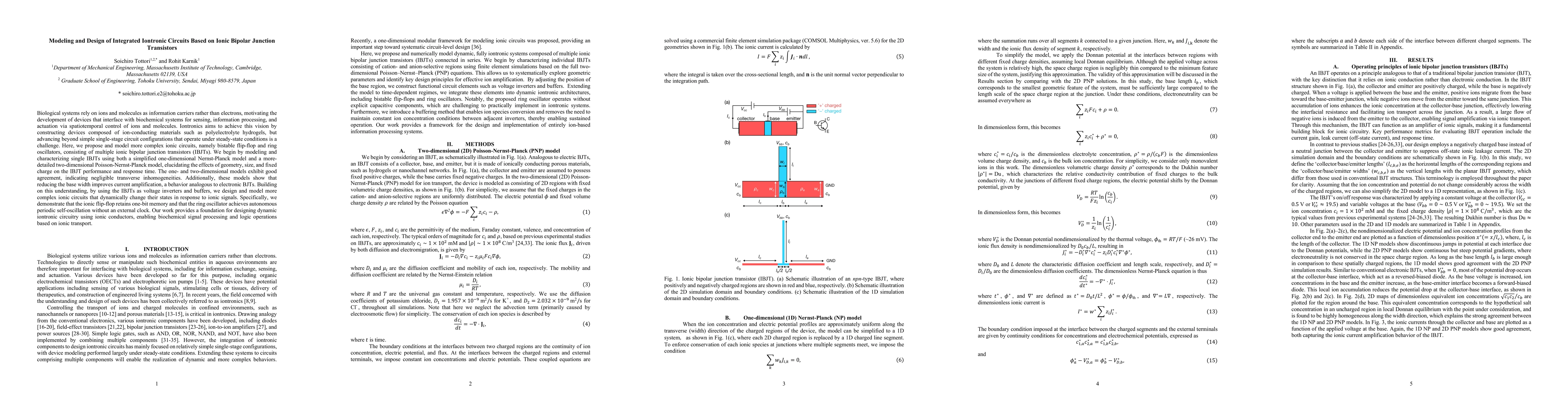 Biological systems rely on ions and molecules as information carriers rather than electrons, motivating the development of devices that interface with biochemical systems for sensing, information processing, and actuation via spatiotemporal control of ions and molecules. Iontronics aims to achieve this vision by constructing devices composed of ion-conducting materials such as polyelectrolyte hydrogels, but advancing beyond simple single-stage circuit configurations that operate under steady-state conditions is a challenge. Here, we propose and model more complex ionic circuits, namely bistable flip-flop and ring oscillators, consisting of multiple ionic bipolar junction transistors (IBJTs). We begin by modeling and characterizing single IBJTs using both a simplified one-dimensional Nernst-Planck model and a more-detailed two-dimensional Poisson-Nernst-Planck model, elucidating the effects of geometry, size, and fixed charge on the IBJT performance and response time. The one- and two-dimensional models exhibit good agreement, indicating negligible transverse inhomogeneities. Additionally, these models show that reducing the base width improves current amplification, a behavior analogous to electronic BJTs. Building on this understanding, by using the IBJTs as voltage inverters and buffers, we design and model more complex ionic circuits that dynamically change their states in response to ionic signals. Specifically, we demonstrate that the ionic flip-flop retains one-bit memory and that the ring oscillator achieves autonomous periodic self-oscillation without an external clock. Our work provides a foundation for designing dynamic iontronic circuitry using ionic conductors, enabling biochemical signal processing and logic operations based on ionic transport.