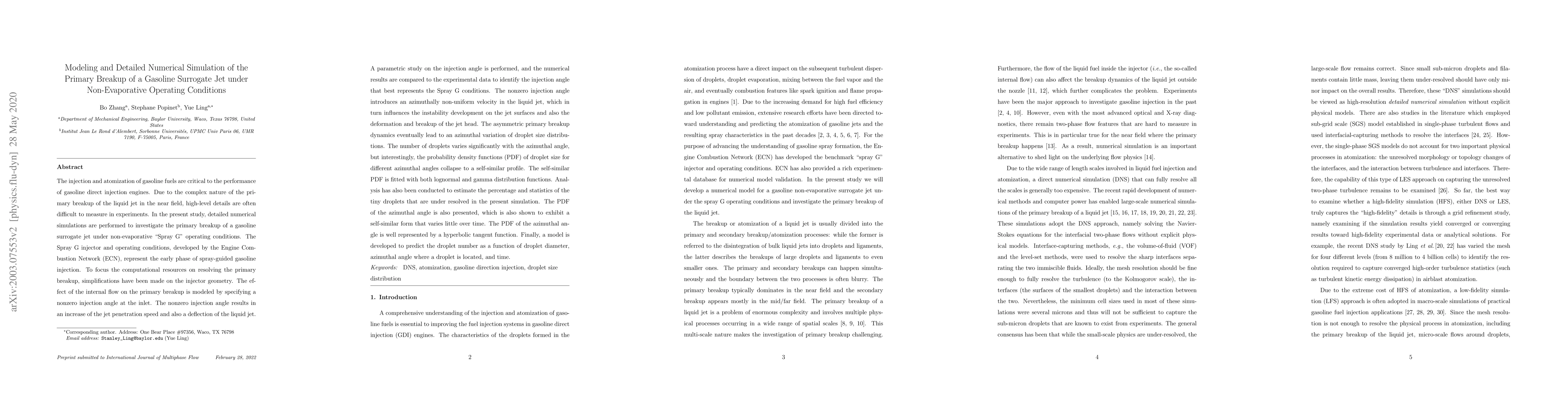 In the present study, detailed numerical simulations are performed to investigate the primary breakup of a gasoline surrogate jet under non-evaporative "Spray G" operating conditions. The Spray G injector and operating conditions, developed by the Engine Combustion Network (ECN), represent the early phase of spray-guided gasoline injection. To focus the computational resources on resolving the primary breakup, simplifications have been made on the injector geometry. The effect of the internal flow on the primary breakup is modeled by specifying a nonzero injection angle at the inlet. The nonzero injection angle results in an increase of the jet penetration speed and also a deflection of the liquid jet. A parametric study on the injection angle is performed, and the numerical results are compared to the experimental data to identify the injection angle that best represents the Spray G conditions. The nonzero injection angle introduces an azimuthally non-uniform velocity in the liquid jet, which in turn influences the instability development on the jet surfaces and also the deformation and breakup of the jet head. The asymmetric primary breakup dynamics eventually lead to an azimuthal variation of droplet size distributions. The number of droplets varies significantly with the azimuthal angle, but interestingly, the probability density functions (PDF) of droplet size for different azimuthal angles collapse to a self-similar profile. Analysis has also been conducted to estimate the percentage and statistics of the tiny droplets that are under resolved in the present simulation. The PDF of the azimuthal angle is also presented, which is also shown to exhibit a self-similar form that varies little over time. Finally, a model is developed to predict the droplet number as a function of droplet diameter, azimuthal angle where a droplet is located, and time.
