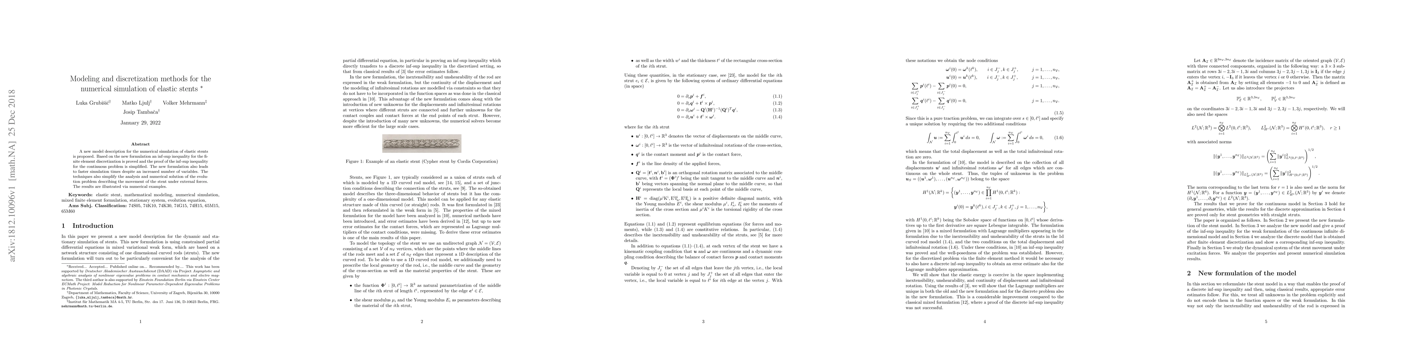 A new model description for the numerical simulation of elastic stents is proposed. Based on the new formulation an inf-sup inequality for the finite element discretization is proved and the proof of the inf-sup inequality for the continuous problem is simplified. The new formulation also leads to faster simulation times despite an increased number of variables. The techniques also simplify the analysis and numerical solution of the evolution problem describing the movement of the stent under external forces. The results are illustrated via numerical examples.