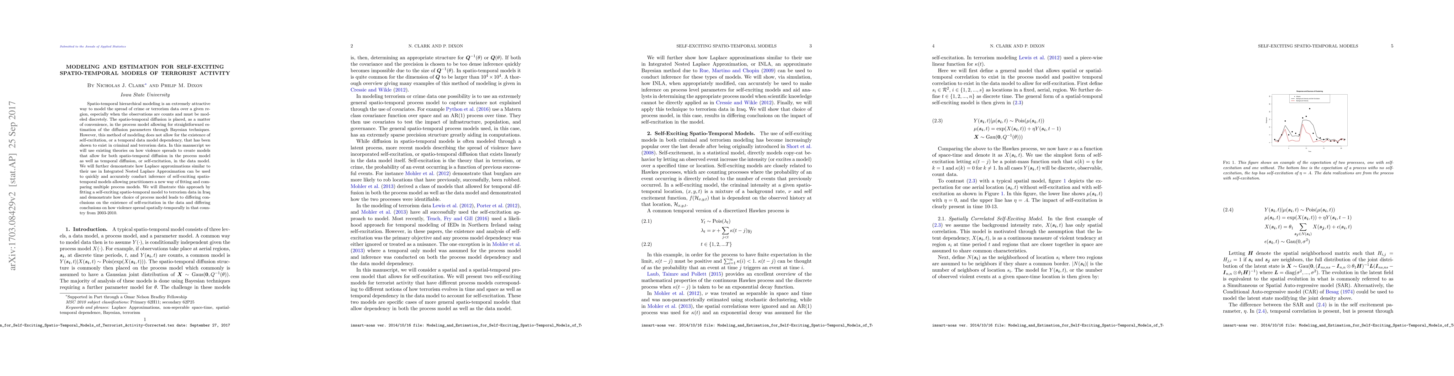 This paper develops self-exciting spatio-temporal models to better capture the spread of terrorism, incorporating both spatial and temporal diffusion. It employs Laplace approximations for efficient estimation and demonstrates the approach using terrorism data from Iraq, highlighting the impact of model choice on inferences about self-excitation and spatial-temporal spread.