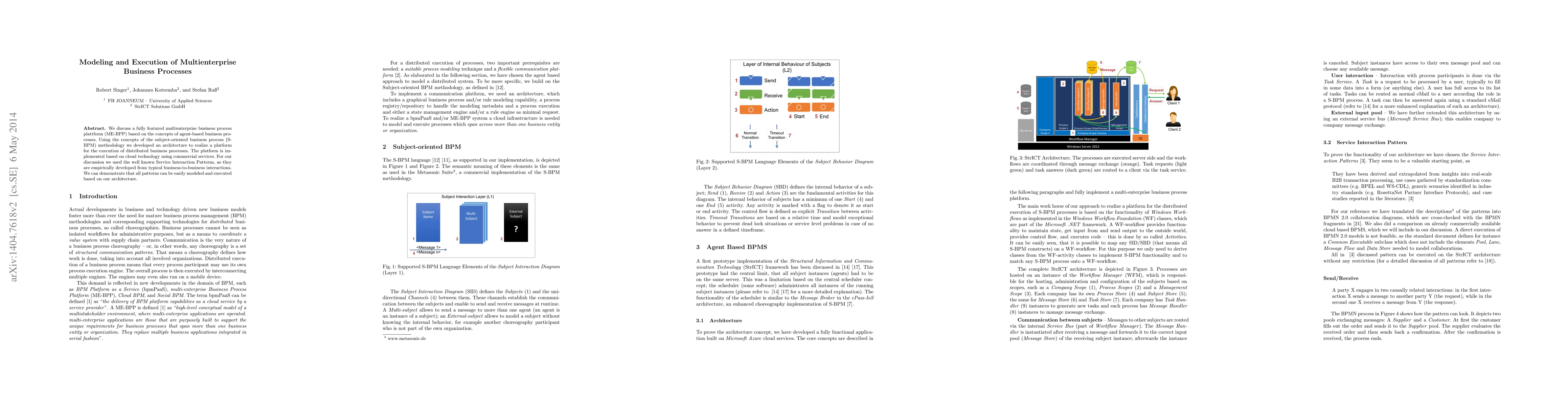 This paper presents a multienterprise business process platform (ME-BPP) utilizing agent-based concepts and subject-oriented business process methodology (S-BPM) to execute distributed business processes. The platform leverages cloud technology and commercial services, demonstrating the modeling and execution of Service Interaction Patterns for business-to-business interactions.