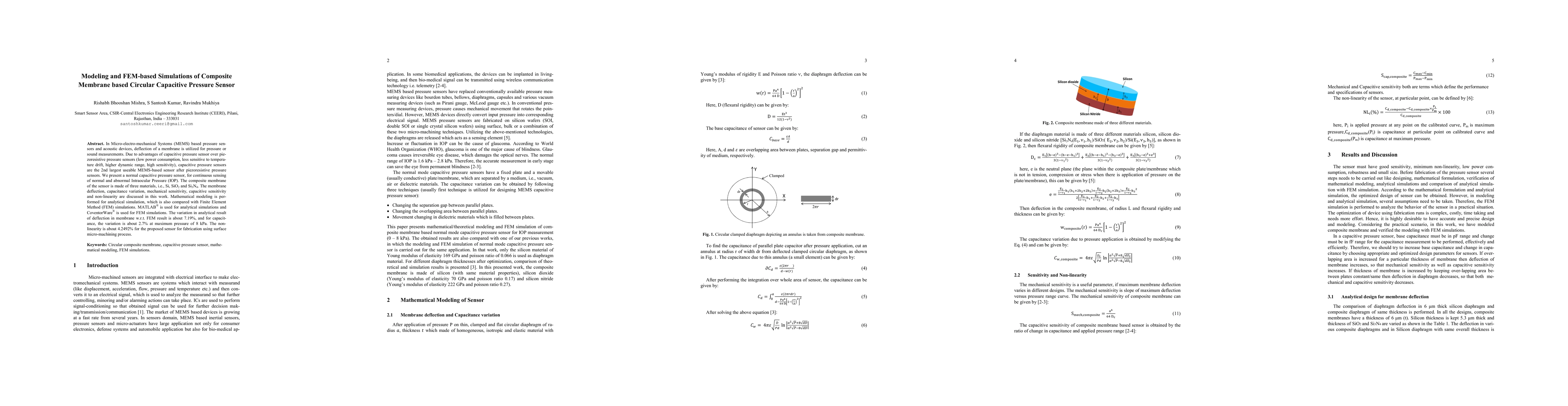 The paper presents a comprehensive mathematical modeling and FEM-based simulation approach for a composite membrane-based circular capacitive pressure sensor, providing insights into its deflection, capacitance variation, and sensitivity.