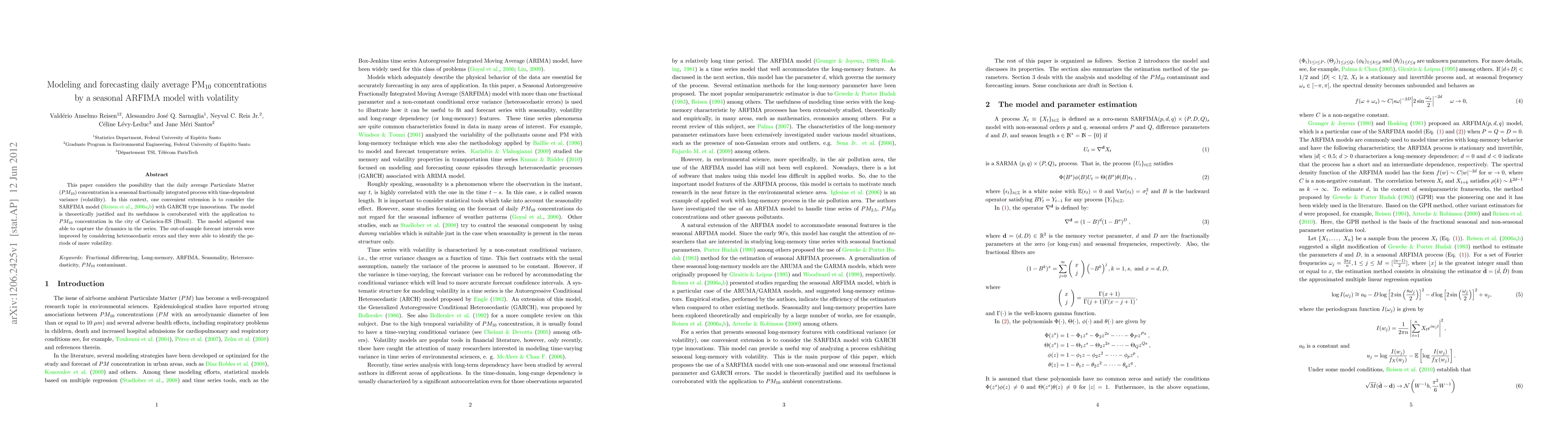 This paper considers the possibility that the daily average Particulate Matter (PM$_{10}$) concentration is a seasonal fractionally integrated process with time-dependent variance (volatility). In this context, one convenient extension is to consider the SARFIMA model (Reisen, et al, 2006a,b) with GARCH type innovations. The model is theoretically justified and its usefulness is corroborated with the application to PM$_{10}$ concentration in the city of Cariacica-ES (Brazil). The model adjusted was able to capture the dynamics in the series. The out-of-sample forecast intervals were improved by considering heteroscedastic errors and they were able to identify the periods of more volatility.