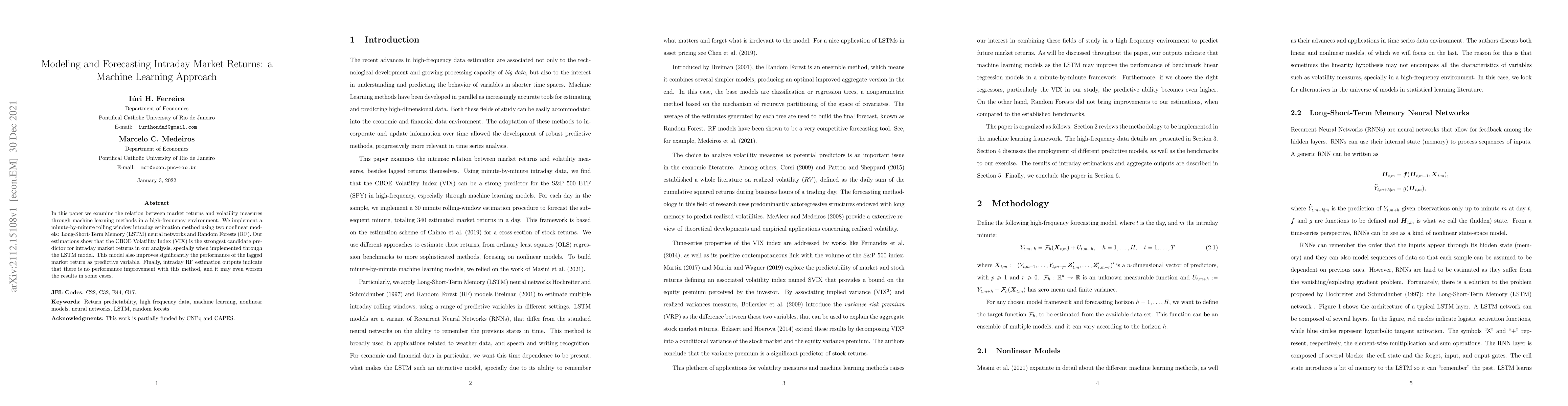 This paper employs machine learning techniques, specifically LSTM neural networks and Random Forests, to model and forecast intraday market returns using high-frequency data. The CBOE Volatility Index (VIX) emerges as the strongest predictor, especially when used with LSTM, which also enhances the predictive power of lagged market returns. In contrast, Random Forest models do not show significant performance improvements.