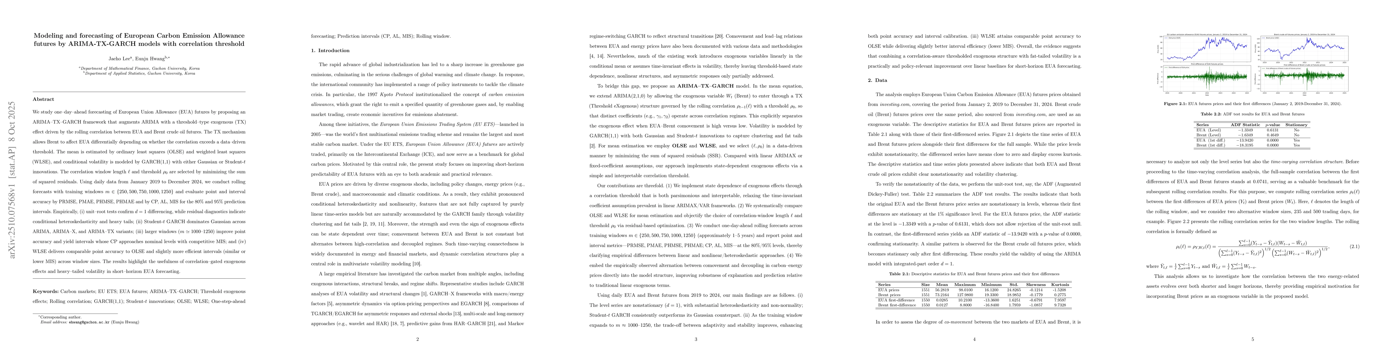 The study introduces an ARIMA-TX-GARCH model for EUA futures that incorporates exogenous Brent effects through a correlation threshold, couples mean with heavy-tailed conditional volatility, and uses rolling windows for parameter optimization.