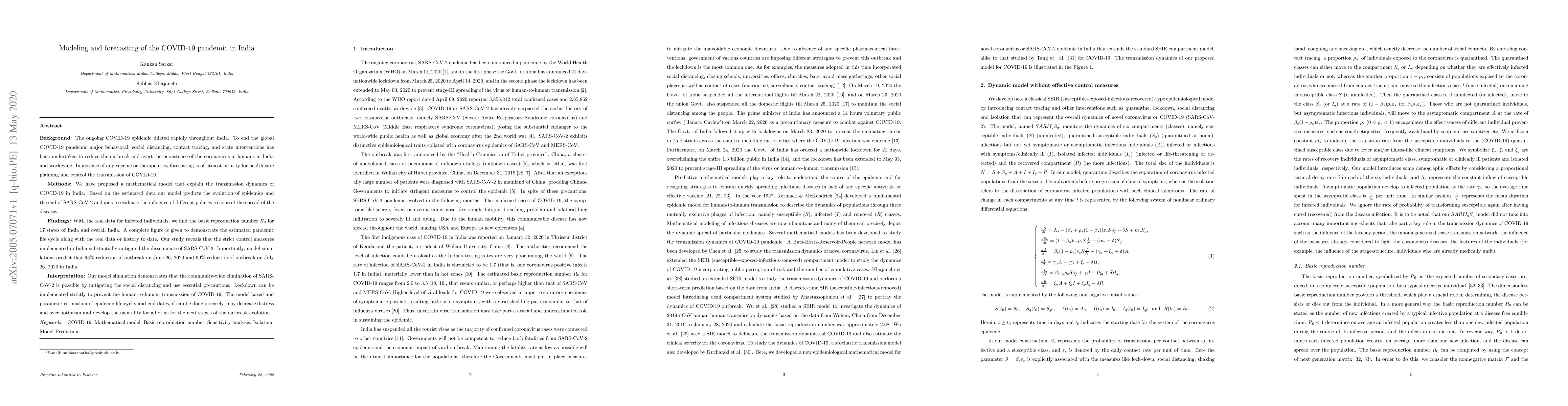 This paper proposes a mathematical model to forecast the COVID-19 pandemic in India, finding that strict control measures significantly reduced transmission. The model predicts a 95% reduction in cases by June 26, 2020, and a 99% reduction by July 26, 2020, emphasizing the effectiveness of stringent lockdown and social distancing measures.