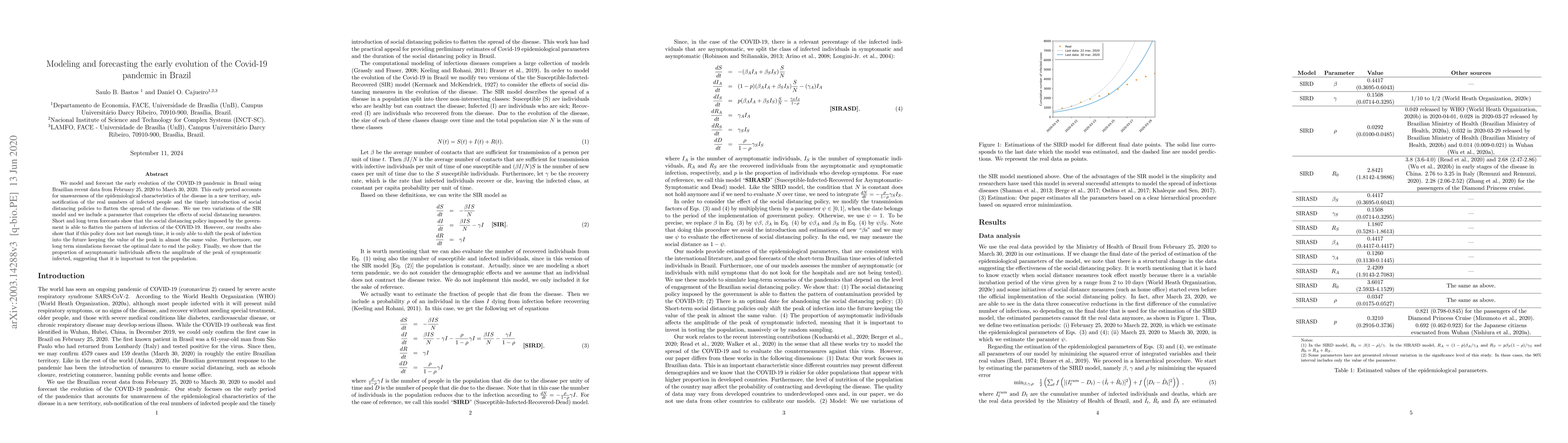We model and forecast the early evolution of the COVID-19 pandemic in Brazil using Brazilian recent data from February 25, 2020 to March 30, 2020. This early period accounts for unawareness of the epidemiological characteristics of the disease in a new territory, sub-notification of the real numbers of infected people and the timely introduction of social distancing policies to flatten the spread of the disease. We use two variations of the SIR model and we include a parameter that comprises the effects of social distancing measures. Short and long term forecasts show that the social distancing policy imposed by the government is able to flatten the pattern of infection of the COVID-19. However, our results also show that if this policy does not last enough time, it is only able to shift the peak of infection into the future keeping the value of the peak in almost the same value. Furthermore, our long term simulations forecast the optimal date to end the policy. Finally, we show that the proportion of asymptomatic individuals affects the amplitude of the peak of symptomatic infected, suggesting that it is important to test the population.