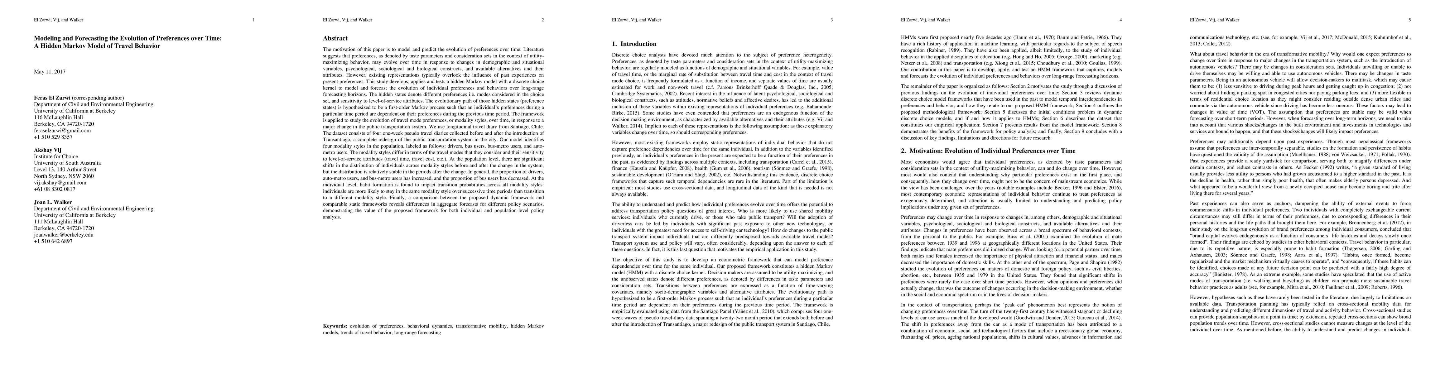 Literature suggests that preferences, as denoted by taste parameters and consideration sets, may evolve over time in response to changes in demographic and situational variables, psychological, sociological and biological constructs, and available alternatives and their attributes. However, existing representations typically overlook the influence of past experiences on present preferences. This study develops, applies and tests a hidden Markov model with a discrete choice kernel to model and forecast the evolution of individual preferences and behaviors over long-range forecasting horizons. The hidden states denote different preferences i.e. modes considered in the choice set, and sensitivity to level-of-service attributes. The evolutionary path of those hidden states is hypothesized to be a first-order Markov process. The framework is applied to study the evolution of travel mode preferences, or modality styles, over time, in response to a major change in the public transportation system. We use longitudinal travel diary from Santiago, Chile. The dataset consists of four one-week pseudo travel diaries collected before and after the introduction of Transantiago, a complete redesign of the public transportation system in the city. Our model identifies four modality styles in the population: drivers, bus users, bus-metro users, and auto-metro users. The modality styles differ in terms of the travel modes that they consider and their sensitivity to level-of-service attributes. At the population level, there are significant shifts in the distribution of individuals across modality styles before and after the change in the system, but the distribution is relatively stable in the periods after the change. Finally, a comparison between the proposed dynamic framework and comparable static frameworks reveals differences in aggregate forecasts for different policy scenarios.