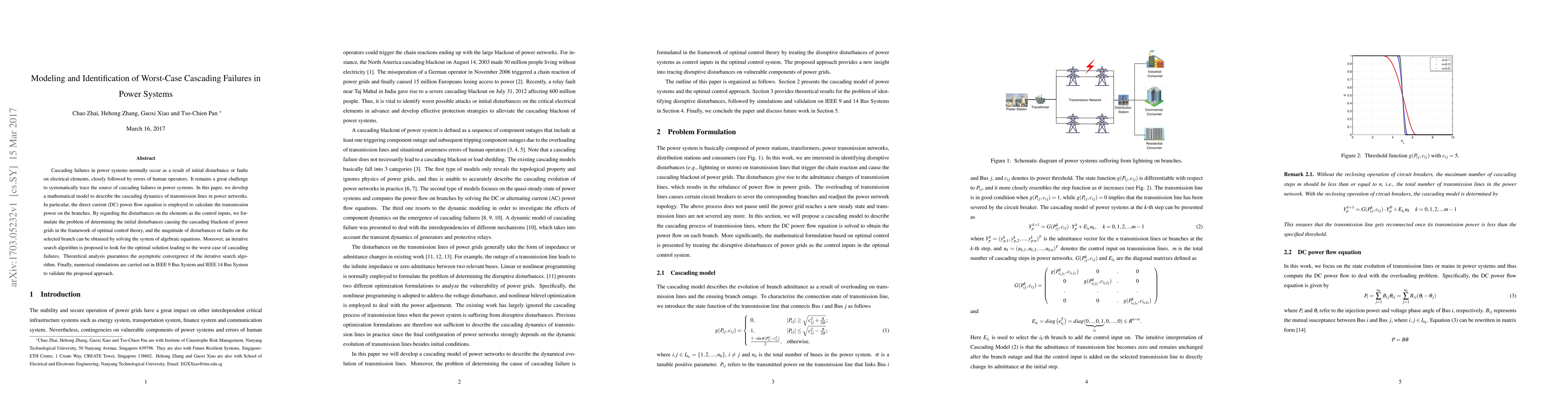 This paper develops a mathematical model using DC power flow equations to simulate cascading failures in power systems. It employs optimal control theory to determine initial disturbances causing blackouts, proposing an iterative search algorithm for worst-case failure identification, validated by simulations on IEEE 9 Bus and IEEE 14 Bus systems.