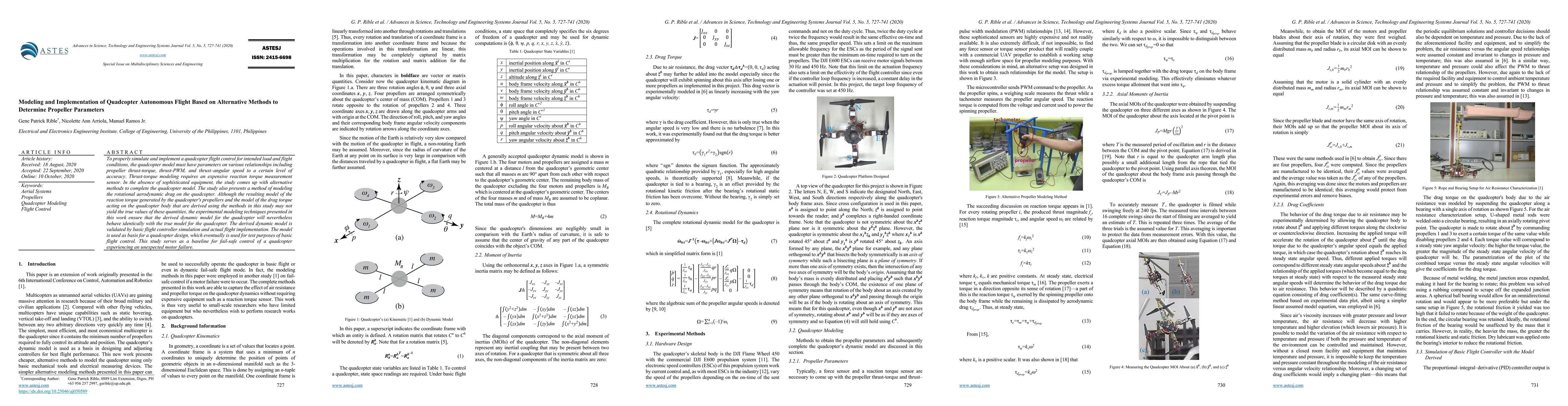 This paper explores alternative methods to determine propeller parameters for quadcopter autonomous flight, focusing on modeling thrust-torque, thrust-PWM, and thrust-angular speed without expensive sensors. It presents a dynamic model validated through simulation and real-flight tests, serving as a baseline for fail-safe control during unexpected motor failures.