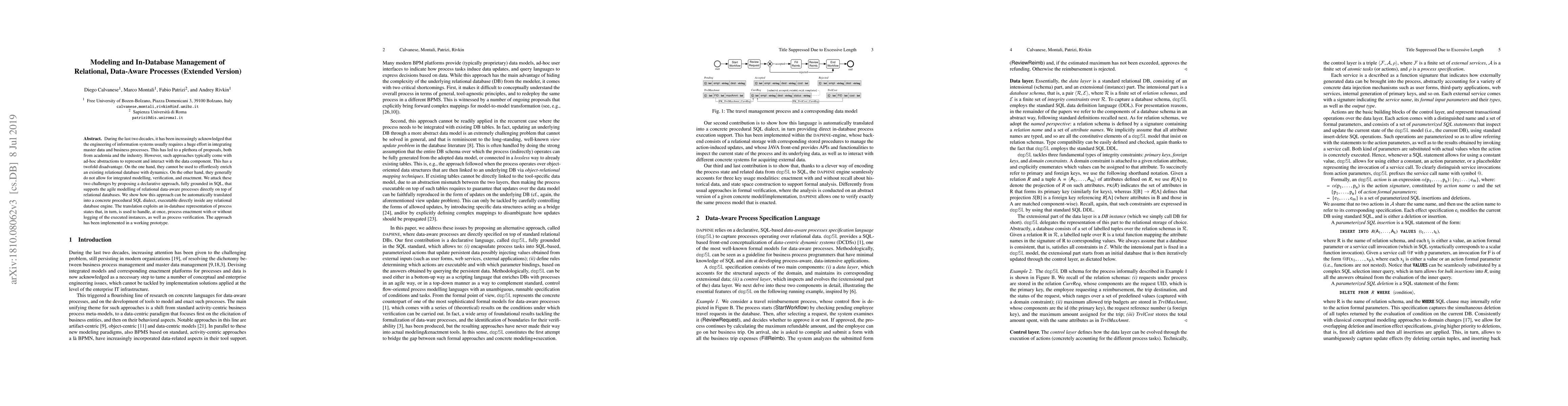 This paper proposes a declarative, SQL-based approach to model and manage relational data-aware processes directly within relational databases, enabling integrated modelling, verification, and enactment without ad-hoc abstractions. The approach is demonstrated through a working prototype that translates the models into procedural SQL for execution.