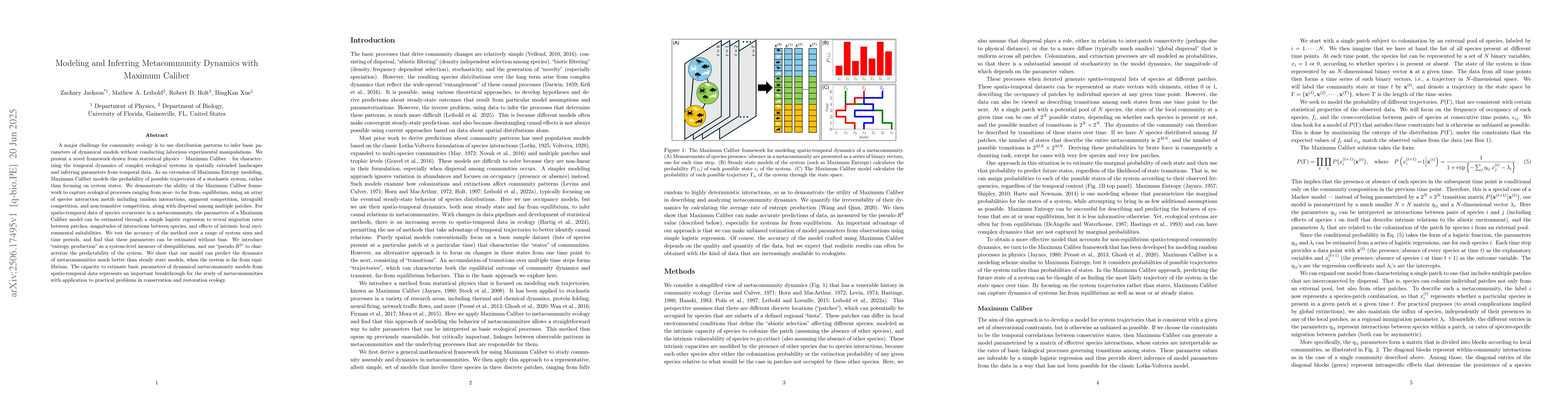 A major challenge for community ecology is to use distribution patterns to infer basic parameters of dynamical models without conducting laborious experimental manipulations. We present a novel framework drawn from statistical physics -- Maximum Caliber -- for characterizing the temporal dynamics of complex ecological systems in spatially extended landscapes and inferring parameters from temporal data. As an extension of Maximum Entropy modeling, Maximum Caliber models the probability of possible trajectories of a stochastic system, rather than focusing on system states. We demonstrate the ability of the Maximum Caliber framework to capture ecological processes ranging from near- to far- from-equilibrium, using an array of species interaction motifs including random interactions, apparent competition, intraguild competition, and non-transitive competition, along with dispersal among multiple patches. For spatio-temporal data of species occurrence in a metacommunity, the parameters of a Maximum Caliber model can be estimated through a simple logistic regression to reveal migration rates between patches, magnitudes of interactions between species, and effects of intrinsic local environmental suitabilities. We test the accuracy of the method over a range of system sizes and time periods, and find that these parameters can be estimated without bias. We introduce entropy production as a system-level measure of disequilibrium, and use ``pseudo-$R^2$'' to characterize the predictability of the system. We show that our model can predict the dynamics of metacommunities much better than steady state models, when the system is far from equilibrium. The capacity to estimate basic parameters of dynamical metacommunity models from spatio-temporal data represents an important breakthrough for the study of metacommunities with application to practical problems in conservation and restoration ecology.