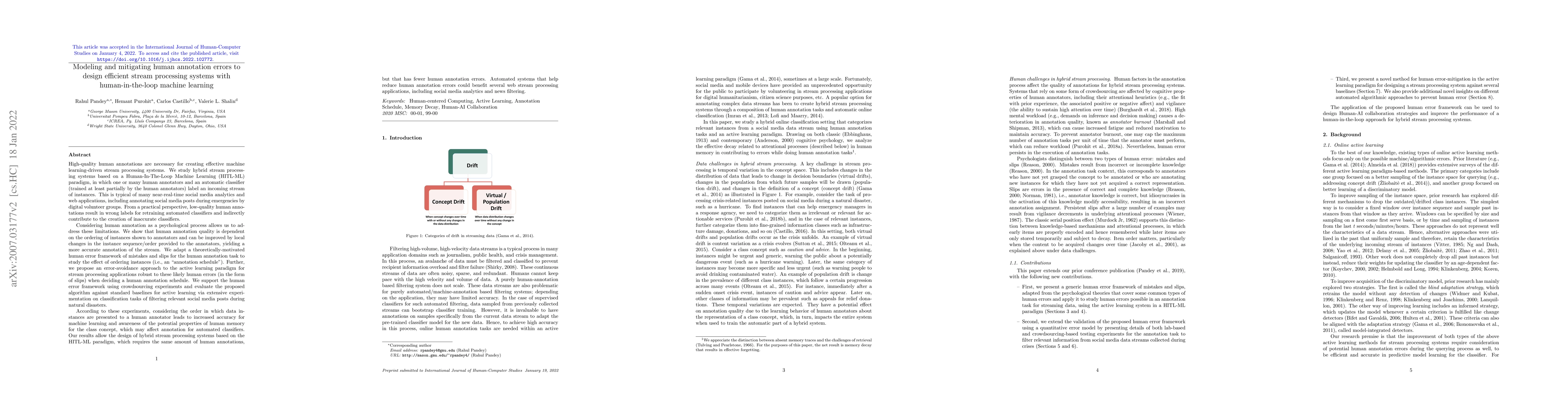 High-quality human annotations are necessary for creating effective machine learning-driven stream processing systems. We study hybrid stream processing systems based on a Human-In-The-Loop Machine Learning (HITL-ML) paradigm, in which one or many human annotators and an automatic classifier (trained at least partially by the human annotators) label an incoming stream of instances. This is typical of many near-real-time social media analytics and web applications, including annotating social media posts during emergencies by digital volunteer groups. From a practical perspective, low-quality human annotations result in wrong labels for retraining automated classifiers and indirectly contribute to the creation of inaccurate classifiers. Considering human annotation as a psychological process allows us to address these limitations. We show that human annotation quality is dependent on the ordering of instances shown to annotators and can be improved by local changes in the instance sequence/order provided to the annotators, yielding a more accurate annotation of the stream. We adapt a theoretically-motivated human error framework of mistakes and slips for the human annotation task to study the effect of ordering instances (i.e., an "annotation schedule"). Further, we propose an error-avoidance approach to the active learning paradigm for stream processing applications robust to these likely human errors (in the form of slips) when deciding a human annotation schedule. We support the human error framework using crowdsourcing experiments and evaluate the proposed algorithm against standard baselines for active learning via extensive experimentation on classification tasks of filtering relevant social media posts during natural disasters.