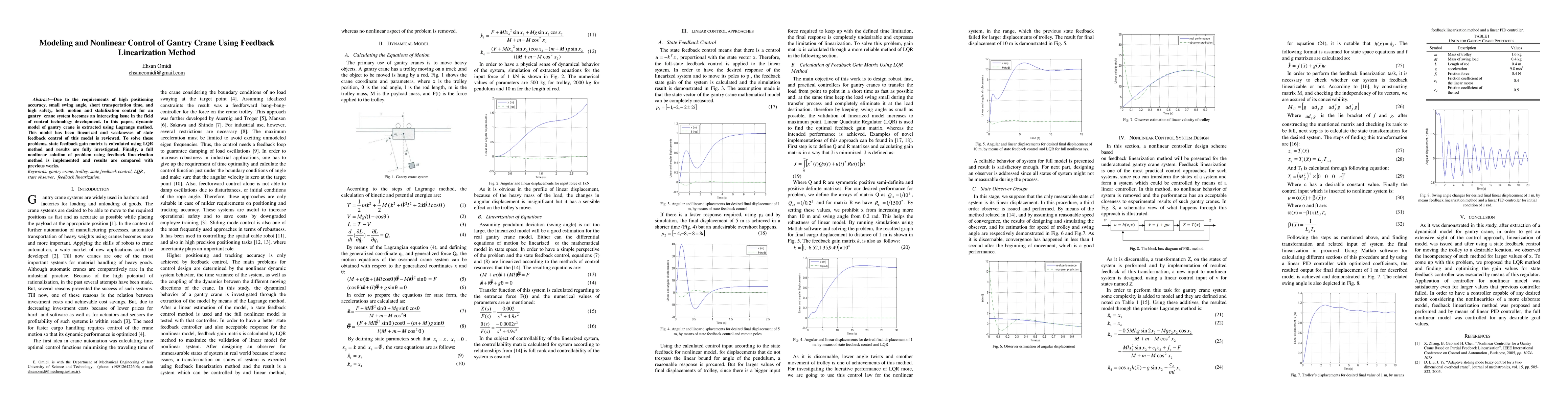 This paper develops a dynamic model of a gantry crane using the Lagrange method, linearizes it, and addresses its control weaknesses with an LQR-based state feedback control. It also implements a nonlinear solution via feedback linearization, comparing results to previous studies.