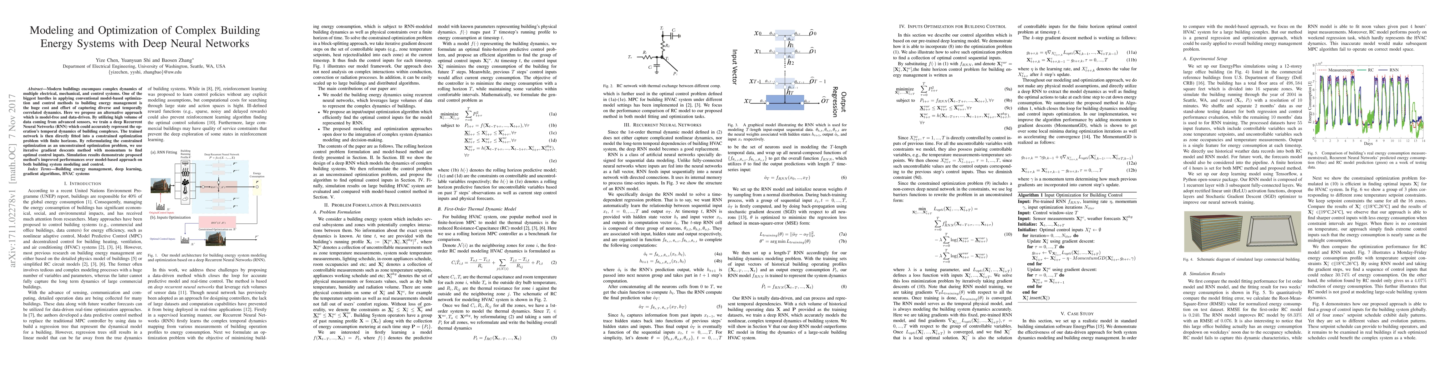 This paper proposes a data-driven approach using deep Recurrent Neural Networks (RNN) to model and optimize complex building energy systems, replacing costly conventional methods. The trained RNN accurately captures temporal dynamics, and an optimization reformulation with gradient descent finds optimal control inputs, outperforming traditional model-based methods in simulations.
