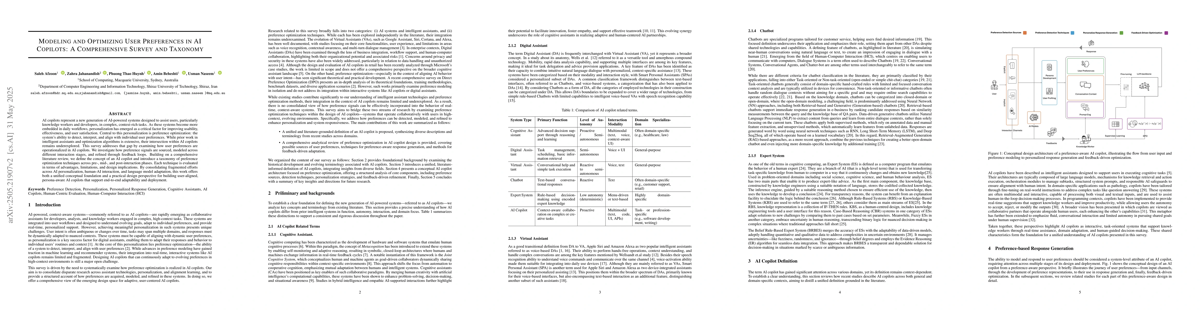 This work stands out by offering a holistic view and structured taxonomy of preference optimization in AI copilots, an area that remains underexplored despite the growing importance of personalization in AI-powered systems.