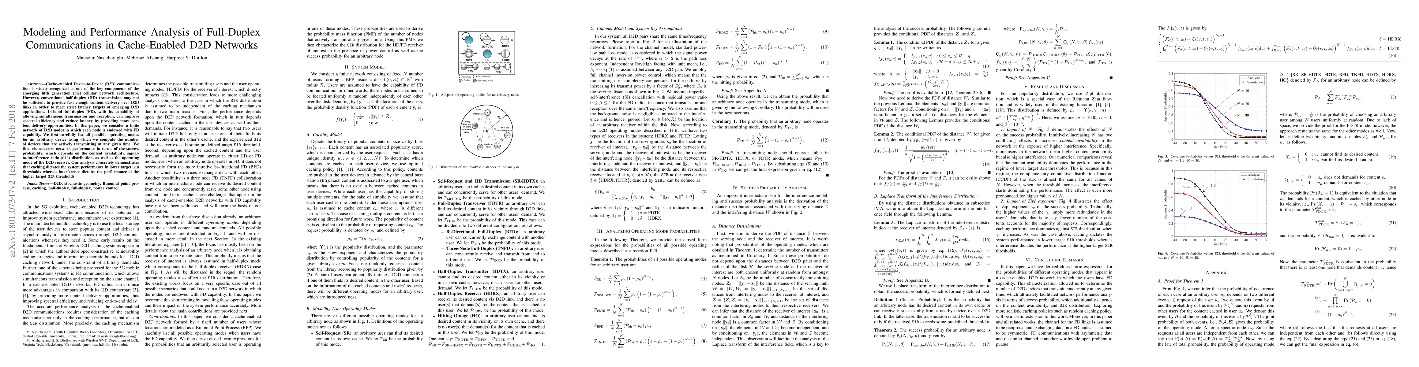 This paper models and analyzes full-duplex (FD) communications in cache-enabled Device-to-Device (D2D) networks, showing that caching impacts performance at lower signal-to-interference ratios (SIR), while interference becomes the main factor at higher SIR thresholds.