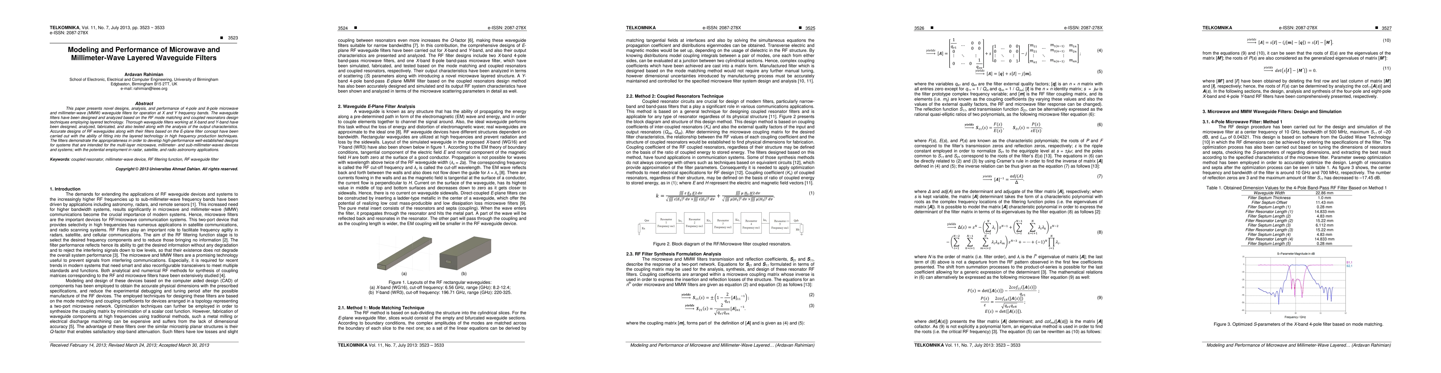 This paper presents novel designs, analysis, and performance of 4-pole and 8-pole microwave and millimeter-wave (MMW) waveguide filters for operation at X and Y frequency bands. The waveguide filters have been designed and analyzed based on the RF mode matching and coupled resonators design techniques employing layered technology. Thorough waveguide filters working at X-band and Y-band have been designed, analyzed, fabricated, and also tested along with the analysis of the output characteristics. Accurate designs of RF waveguides along with their filters based on the E-plane filter concept have been carried out with the ability of fitting into the layered technology in high frequency production techniques. The filters demonstrate the appropriateness in order to develop high-performance well-established designs for systems that are intended for the multi-layer microwave, millimeter- and sub-millimeter-waves devices and systems; with the potential employment in radar, satellite, and radio astronomy applications.