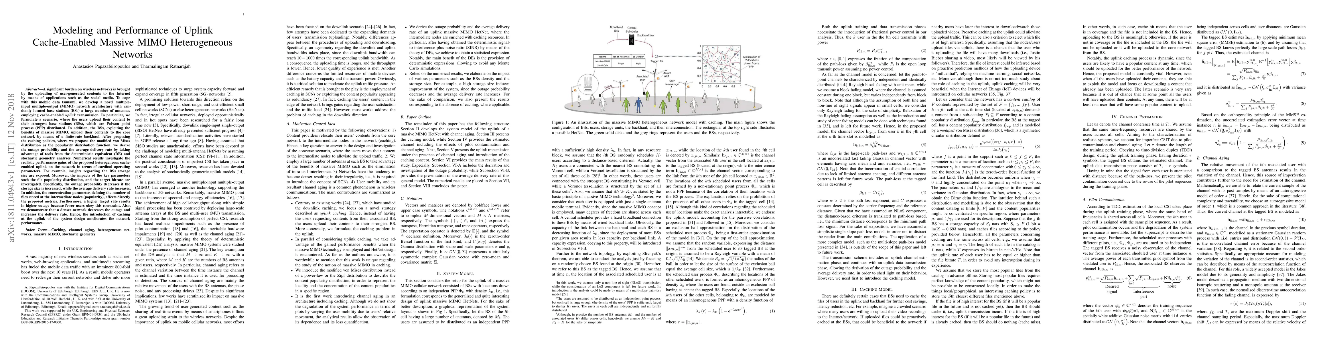 This paper proposes a cache-enabled massive MIMO architecture for uplink transmission in heterogeneous networks, utilizing a Poisson point process for base station distribution. It investigates the impact of caching policies on outage probability and average delivery rate, revealing that increased storage size and network density improve performance while higher target bitrates increase outage.
