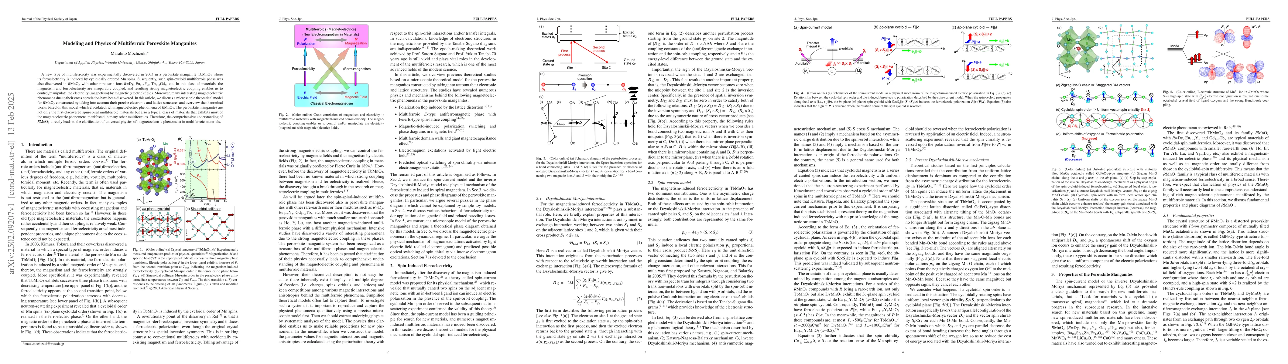 This research advances the understanding of multiferroic perovskite manganites by proposing a comprehensive theoretical model that captures their complex magnetoelectric behavior, going beyond simpler models like J1-J2
