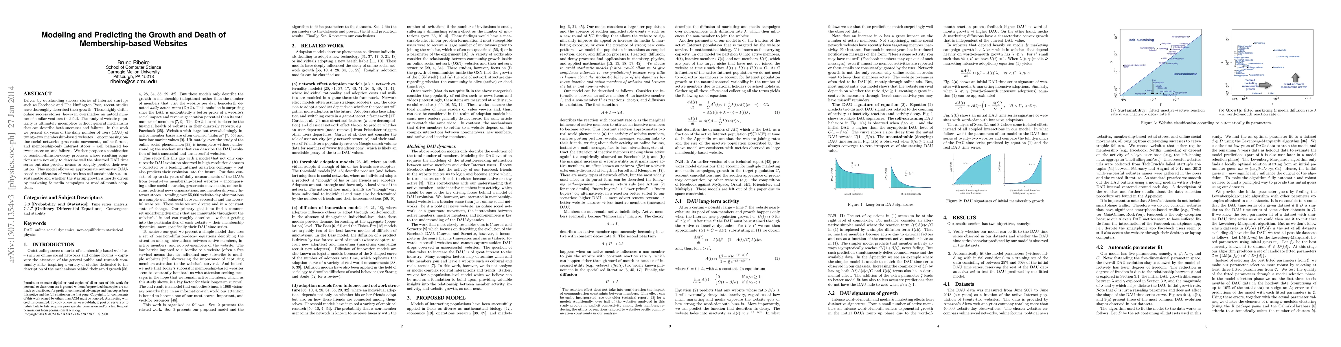 Driven by outstanding success stories of Internet startups such as Facebook and The Huffington Post, recent studies have thoroughly described their growth. These highly visible online success stories, however, overshadow an untold number of similar ventures that fail. The study of website popularity is ultimately incomplete without general mechanisms that can describe both successes and failures. In this work we present six years of the daily number of users (DAU) of twenty-two membership-based websites - encompassing online social networks, grassroots movements, online forums, and membership-only Internet stores - well balanced between successes and failures. We then propose a combination of reaction-diffusion-decay processes whose resulting equations seem not only to describe well the observed DAU time series but also provide means to roughly predict their evolution. This model allows an approximate automatic DAU-based classification of websites into self-sustainable v.s. unsustainable and whether the startup growth is mostly driven by marketing & media campaigns or word-of-mouth adoptions.