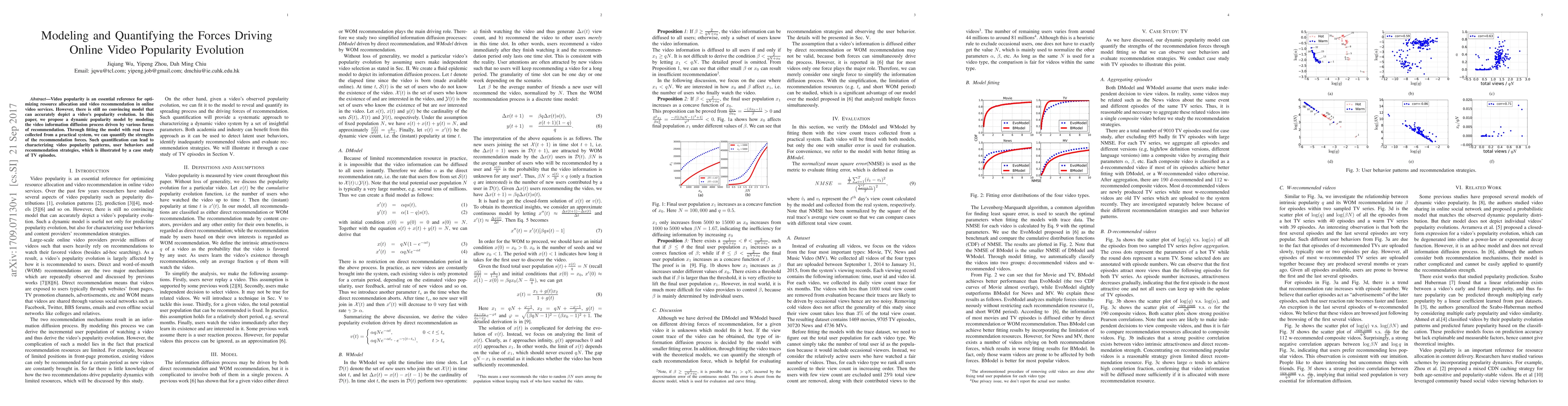 This paper proposes a dynamic model to quantify the forces driving online video popularity evolution, focusing on recommendation-driven information diffusion. The model fits real data to characterize video popularity patterns, user behaviors, and recommendation strategies, demonstrated through a case study on TV episodes.