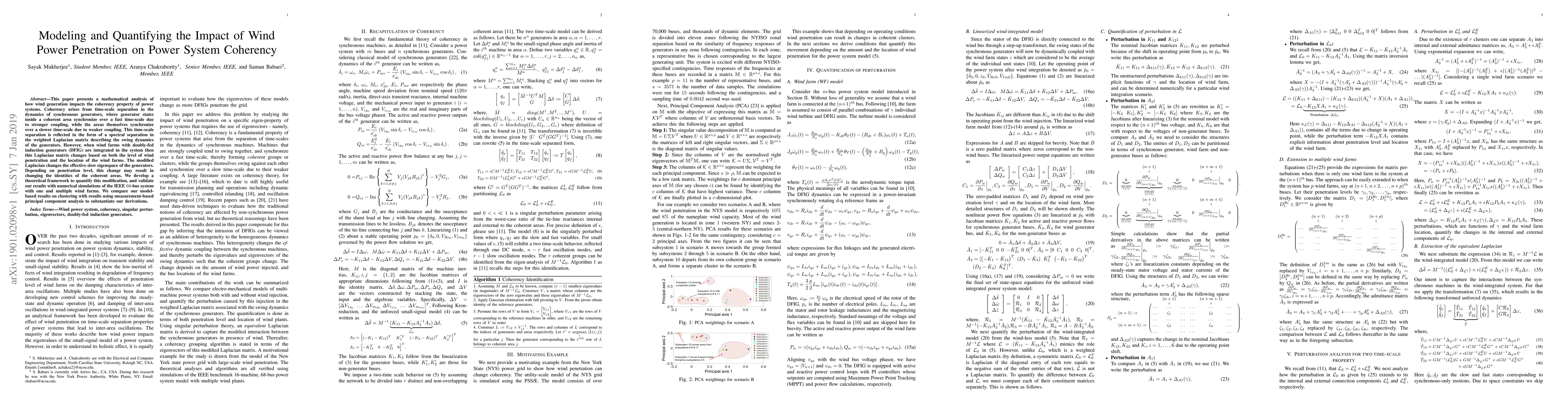 This paper presents a mathematical analysis of how wind generation impacts the coherency property of power systems. Coherency arises from time-scale separation in the dynamics of synchronous generators, where generator states inside a coherent area synchronize over a fast time-scale due to stronger coupling, while the areas themselves synchronize over a slower time-scale due to weaker coupling. This time-scale separation is reflected in the form of a spectral separation in the weighted Laplacian matrix describing the swing dynamics of the generators. However, when wind farms with doubly-fed induction generators (DFIG) are integrated in the system then this Laplacian matrix changes based on both the level of wind penetration and the location of the wind farms. The modified Laplacian changes the effective slow eigenspace of the generators. Depending on penetration level, this change may result in changing the identities of the coherent areas. We develop a theoretical framework to quantify this modification, and validate our results with numerical simulations of the IEEE 68-bus system with one and multiple wind farms. We compare our model based results on clustering with results using measurement-based principal component analysis to substantiate our derivations.