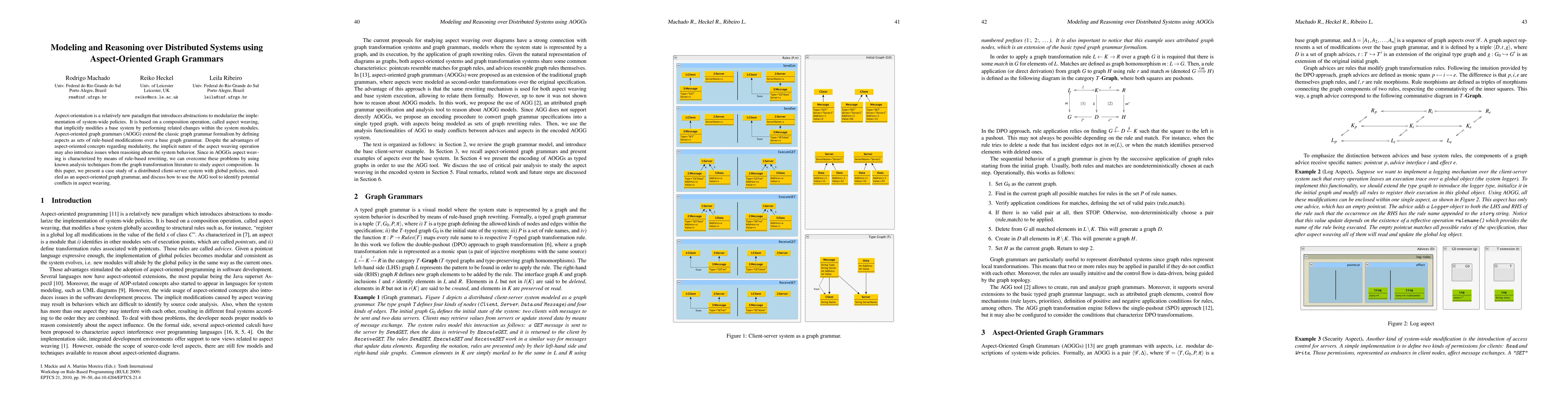Aspect-orientation is a relatively new paradigm that introduces abstractions to modularize the implementation of system-wide policies. It is based on a composition operation, called aspect weaving, that implicitly modifies a base system by performing related changes within the system modules. Aspect-oriented graph grammars (AOGG) extend the classic graph grammar formalism by defining aspects as sets of rule-based modifications over a base graph grammar. Despite the advantages of aspect-oriented concepts regarding modularity, the implicit nature of the aspect weaving operation may also introduce issues when reasoning about the system behavior. Since in AOGGs aspect weaving is characterized by means of rule-based rewriting, we can overcome these problems by using known analysis techniques from the graph transformation literature to study aspect composition. In this paper, we present a case study of a distributed client-server system with global policies, modeled as an aspect-oriented graph grammar, and discuss how to use the AGG tool to identify potential conflicts in aspect weaving.