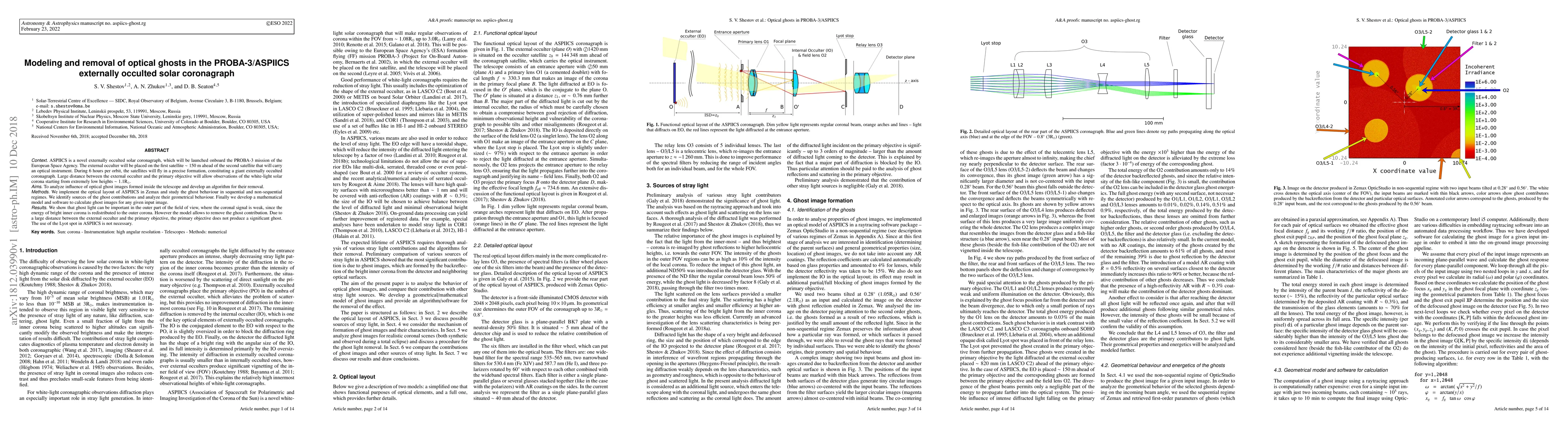 Context: ASPIICS is a novel externally occulted solar coronagraph, which will be launched onboard the PROBA-3 mission of the European Space Agency. The external occulter will be placed on the first satellite approximately 150 m ahead of the second satellite that will carry an optical instrument. During 6 hours per orbit, the satellites will fly in a precise formation, constituting a giant externally occulted coronagraph. Large distance between the external occulter and the primary objective will allow observations of the white-light solar corona starting from extremely low heights 1.1RSun. Aims: To analyze influence of optical ghost images formed inside the telescope and develop an algorithm for their removal. Methods: We implement the optical layout of ASPIICS in Zemax and study the ghost behaviour in sequential and non-sequential regimes. We identify sources of the ghost contributions and analyze their geometrical behaviour. Finally we develop a mathematical model and software to calculate ghost images for any given input image. Results: We show that ghost light can be important in the outer part of the field of view, where the coronal signal is weak, since the energy of bright inner corona is redistributed to the outer corona. However the model allows to remove the ghost contribution. Due to a large distance between the external occulter and the primary objective, the primary objective does not produce a significant ghost. The use of the Lyot spot in ASPIICS is not necessary.