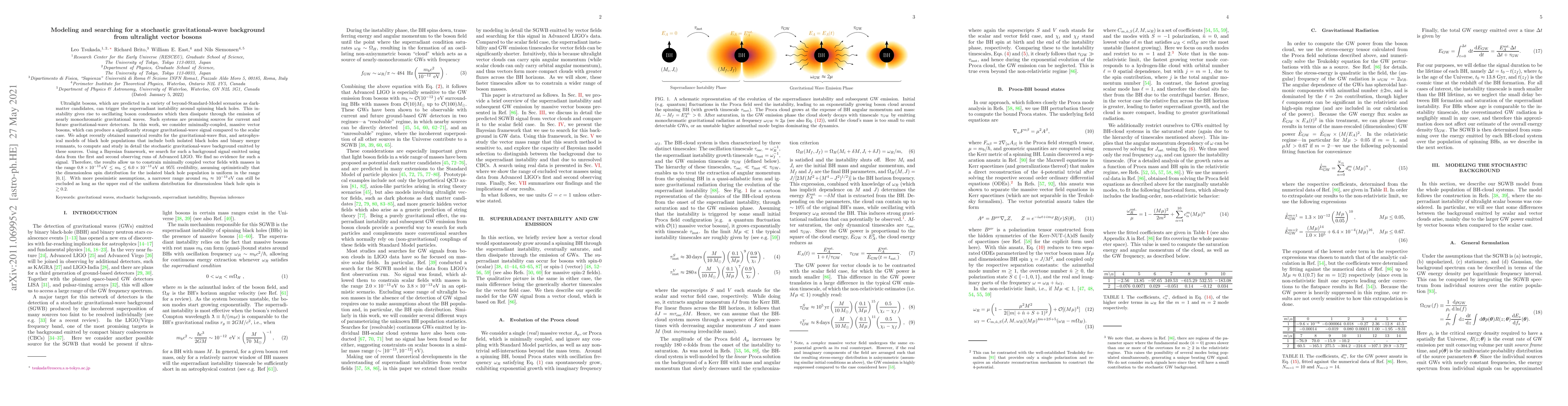 This paper models and searches for a stochastic gravitational-wave background from ultralight vector bosons, which could arise from superradiant instabilities around spinning black holes. The study finds no evidence for such a signal in Advanced LIGO data, thereby constraining the mass range of these vector bosons to $0.8\times10^{-13}\mathrm{eV}\leq m_b\leq 6.0\times10^{-13}\mathrm{eV}$ at 95% credibility.