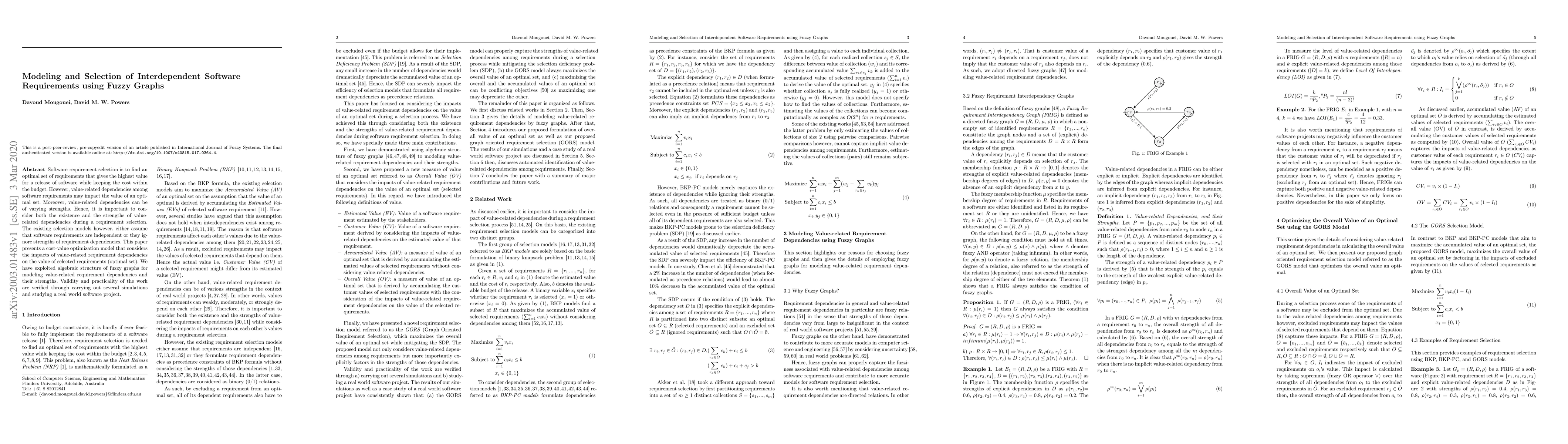 This paper presents a cost-value optimization model using fuzzy graphs to select interdependent software requirements, considering both the existence and strengths of value-related dependencies. The model's validity and practicality are demonstrated through simulations and a real-world software project study.