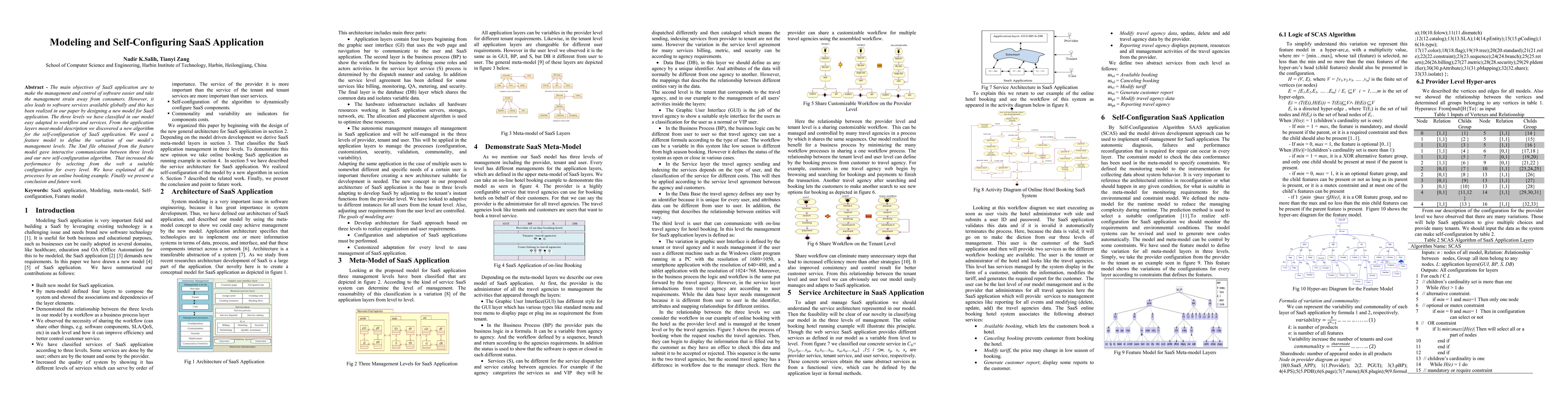 The main objectives of SaaS application are to make the management and control of software easier and take the management strain away from consumers. However, it also leads to software services available globally and this has been realized in our paper by designing a new model for SaaS application. The three levels we have classified in our model easy adapted to workflow and services. From the application layers meat-model description we discovered a new algorithm for the self-configuration of SaaS application. We used a feature model to define the variation of our model's management levels. The Xml file obtained from the feature model gave interactive communication between three levels and our new self-configuration algorithm. That increased the performance by selecting from the web a suitable configuration for every level. We have explained all the processes by an online booking example. Finally we present a conclusion and future work.