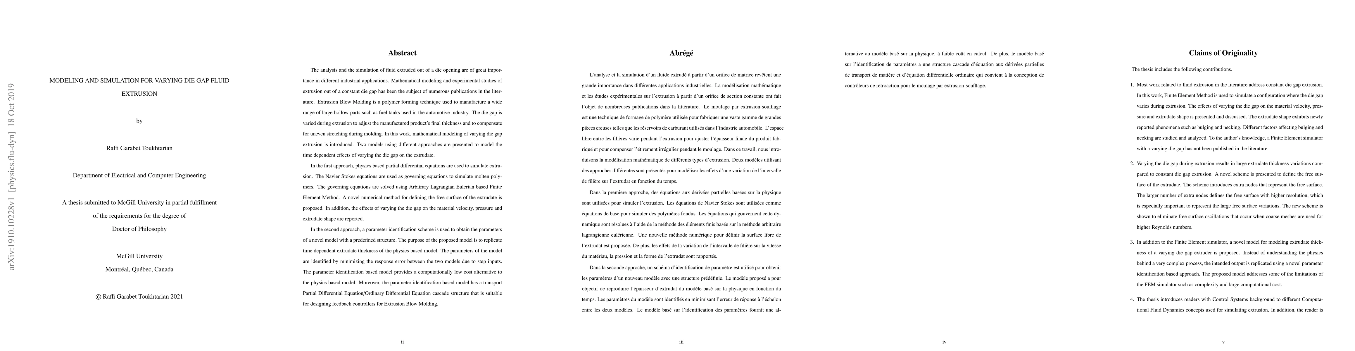 This research introduces mathematical models for simulating varying die gap fluid extrusion, crucial in industrial processes like Extrusion Blow Molding. It presents two methods: one using physics-based partial differential equations solved via Finite Element Method, and another employing a parameter identification scheme for a predefined model structure, both capturing time-dependent extrudate thickness and shape effects.