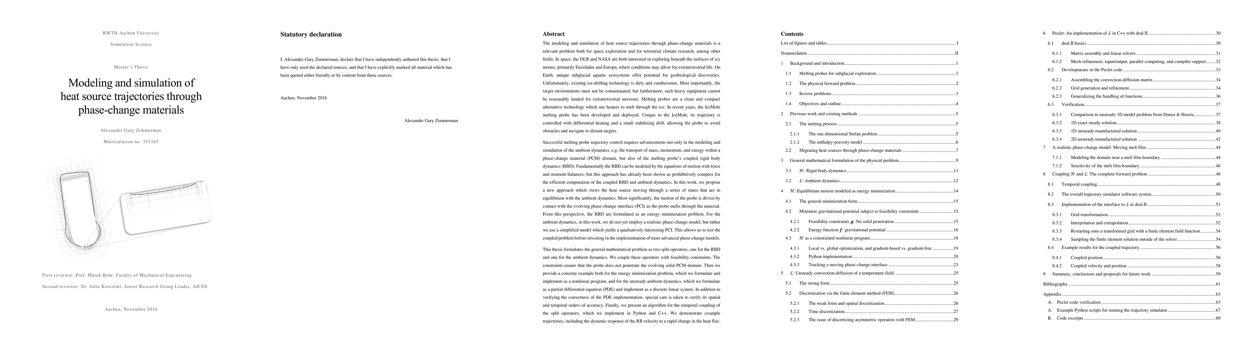 This research proposes a method to model and simulate heat source trajectories through phase-change materials, like ice, using energy minimization and split operators. It aims to improve melting probe control for space exploration and terrestrial climate research, offering a simpler alternative to traditional complex rigid body dynamics equations.