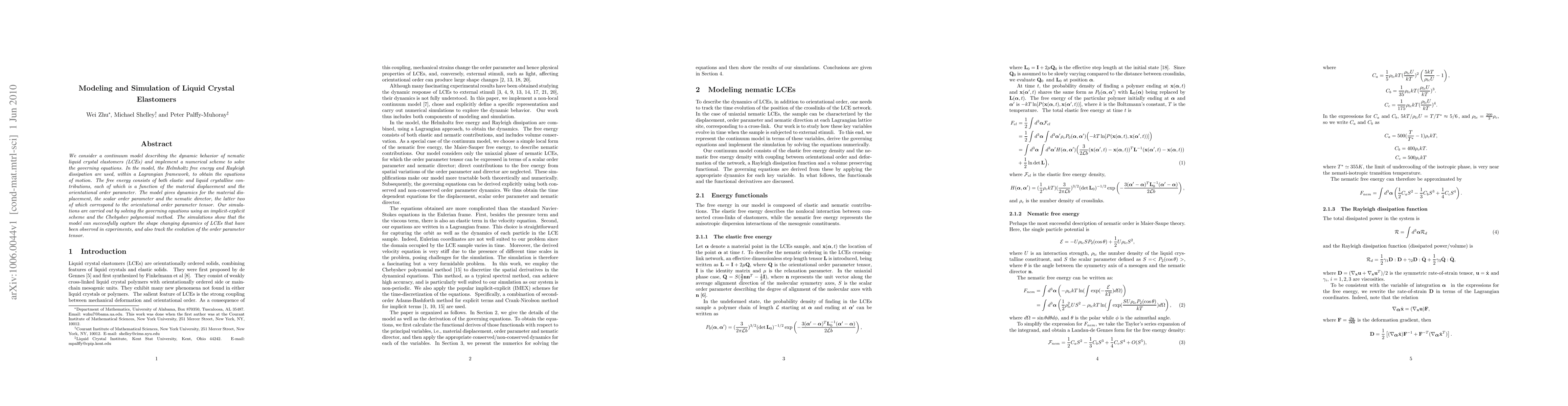 We consider a continuum model describing the dynamic behavior of nematic liquid crystal elastomers (LCEs) and implement a numerical scheme to solve the governing equations. In the model, the Helmholtz free energy and Rayleigh dissipation are used, within a Lagrangian framework, to obtain the equations of motion. The free energy consists of both elastic and liquid crystalline contributions, each of which is a function of the material displacement and the orientational order parameter. The model gives dynamics for the material displacement, the scalar order parameter and the nematic director, the latter two of which correspond to the orientational order parameter tensor. Our simulations are carried out by solving the governing equations using an implicit-explicit scheme and the Chebyshev polynomial method. The simulations show that the model can successfully capture the shape changing dynamics of LCEs that have been observed in experiments, and also track the evolution of the order parameter tensor.