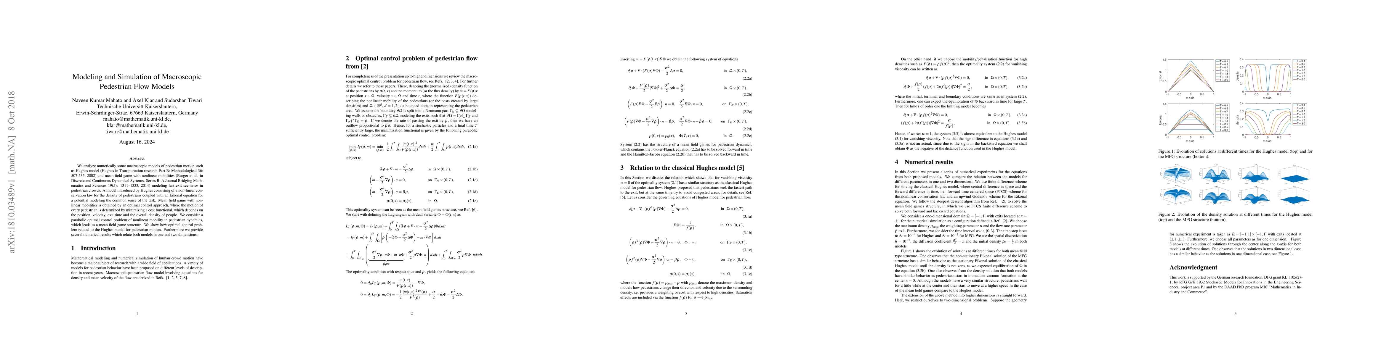 We analyze numerically some macroscopic models of pedestrian motion such as Hughes model [1] and mean field game with nonlinear mobilities [2] modeling fast exit scenarios in pedestrian crowds. A model introduced by Hughes consisting of a non-linear conservation law for the density of pedestrians coupled with an Eikonal equation for a potential modeling the common sense of the task. Mean field game with nonlinear mobilities is obtained by an optimal control approach, where the motion of every pedestrian is determined by minimizing a cost functional, which depends on the position, velocity, exit time and the overall density of people. We consider a parabolic optimal control problem of nonlinear mobility in pedestrian dynamics, which leads to a mean field game structure. We show how optimal control problem related to the Hughes model for pedestrian motion. Furthermore we provide several numerical results which relate both models in one and two dimensions. References [1] Hughes R.L.: A continuum theory for the flow of pedestrians, Transportation Research Part B: Methodological, 36, 507-535 (2000) [2] Burger M., Di Francesco M., Markowich P.A., Wolfram M-T.: Mean field games with nonlinear mobilities in pedestrian dynamics, Discrete and Continuous Dynamical Systems. Series B. A Journal Bridging Mathematics and Sciences, 19, 1311-1333 (2014)