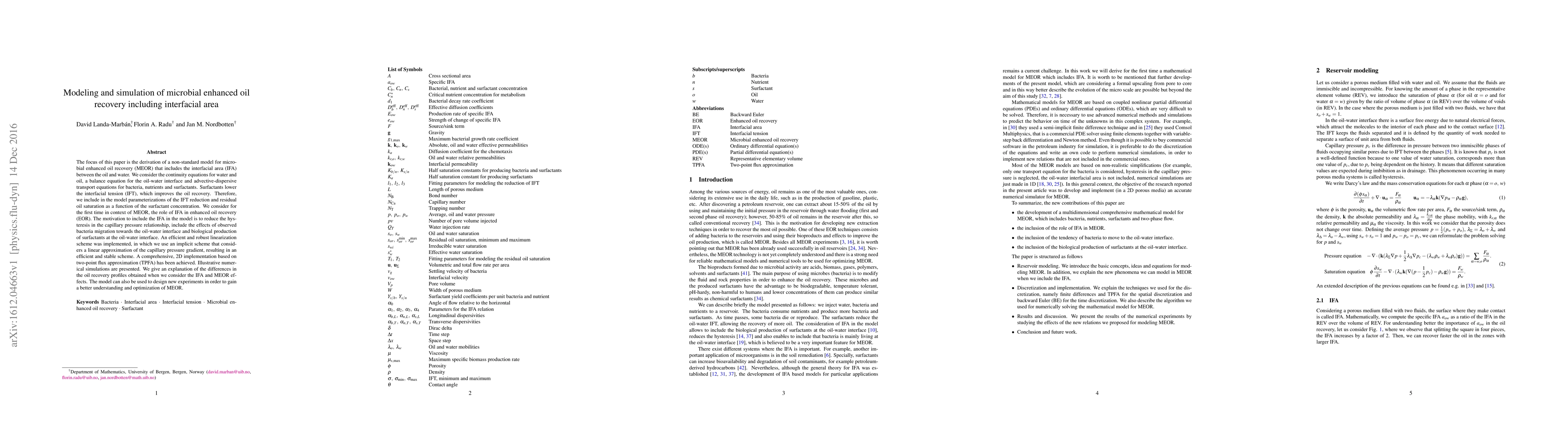 The focus of this paper is the derivation of a non-standard model for microbial enhanced oil recovery (MEOR) that includes the interfacial area (IFA) between the oil and water. We consider the continuity equations for water and oil, a balance equation for the oil-water interface and advective-dispersive transport equations for bacteria, nutrients and surfactants. Surfactants lower the interfacial tension (IFT), which improves the oil recovery. Therefore, we include in the model parameterizations of the IFT reduction and residual oil saturation as a function of the surfactant concentration. We consider for the first time in context of MEOR, the role of IFA in enhanced oil recovery (EOR). The motivation to include the IFA in the model is to reduce the hysteresis in the capillary pressure relationship, include the effects of observed bacteria migration towards the oil-water interface and biological production of surfactants at the oil-water interface. An efficient and robust linearization scheme was implemented, in which we use an implicit scheme that considers a linear approximation of the capillary pressure gradient, resulting in an efficient and stable scheme. A comprehensive, 2D implementation based on two-point flux approximation (TPFA) has been achieved. Illustrative numerical simulations are presented. We give an explanation of the differences in the oil recovery profiles obtained when we consider the IFA and MEOR effects. The model can also be used to design new experiments in order to gain a better understanding and optimization of MEOR.