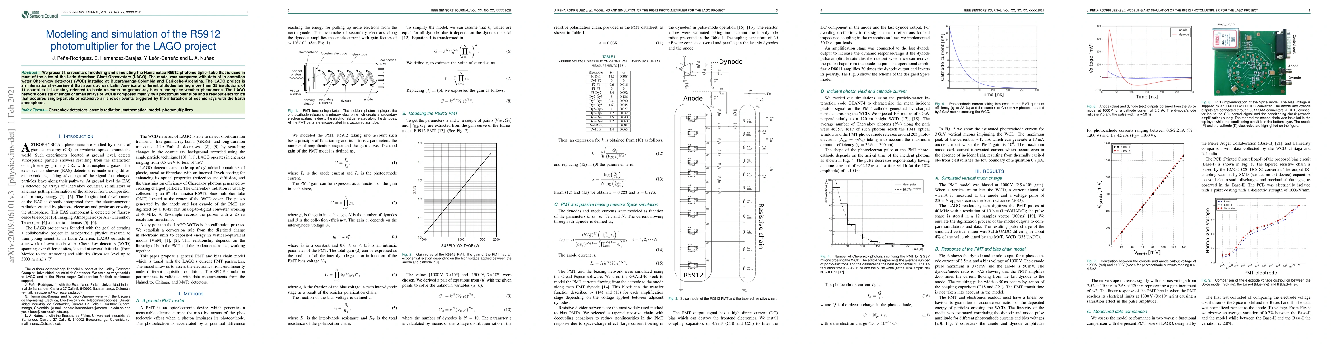 The research presents a modeling and simulation of the Hamamatsu R5912 photomultiplier tube (PMT) used in the Latin American Giant Observatory (LAGO) project. The model was validated against data from operational water Cherenkov detectors (WCD) in Bucaramanga, Colombia, and Bariloche, Argentina.