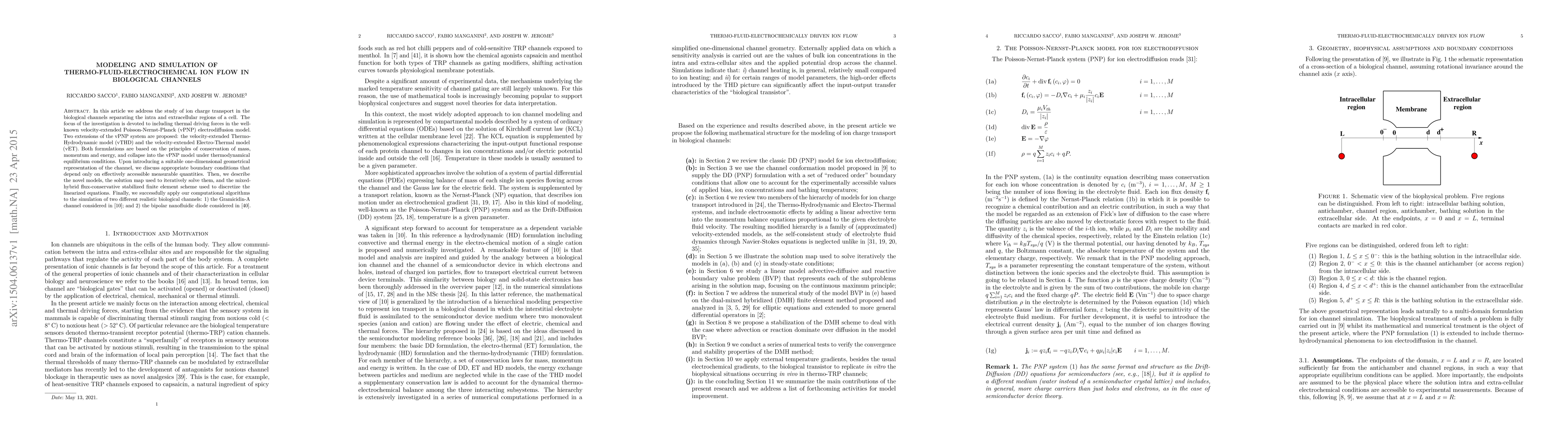 This paper proposes two extended models, vTHD and vET, to simulate thermo-fluid-electrochemical ion flow in biological channels, incorporating thermal driving forces into the vPNP electrodiffusion model. The models are applied to simulate ion transport in Gramicidin-A and bipolar nanofluidic diode channels using a mixed-hybrid finite element scheme.