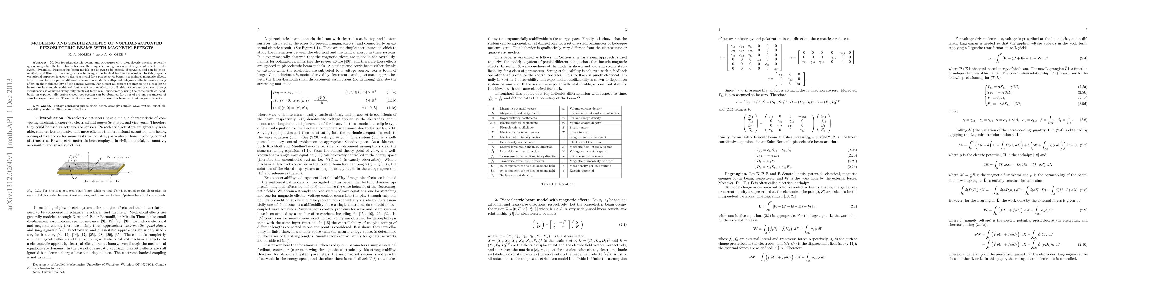 This paper develops a model for voltage-actuated piezoelectric beams that incorporates magnetic effects, proving the model's well-posedness. It finds that magnetic effects significantly impact stabilizability, with strong stabilization achievable via electrical feedback, though not exponentially in the energy space.