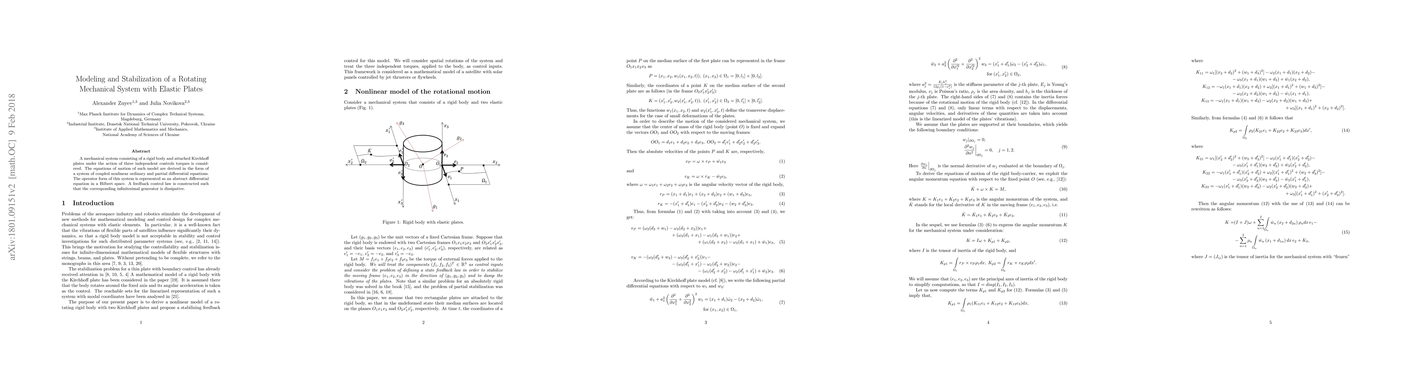 A mathematical model is developed to study a mechanical system with rotating rigid body and elastic plates under three independent control torques. A feedback control law is constructed to ensure the system remains stable.