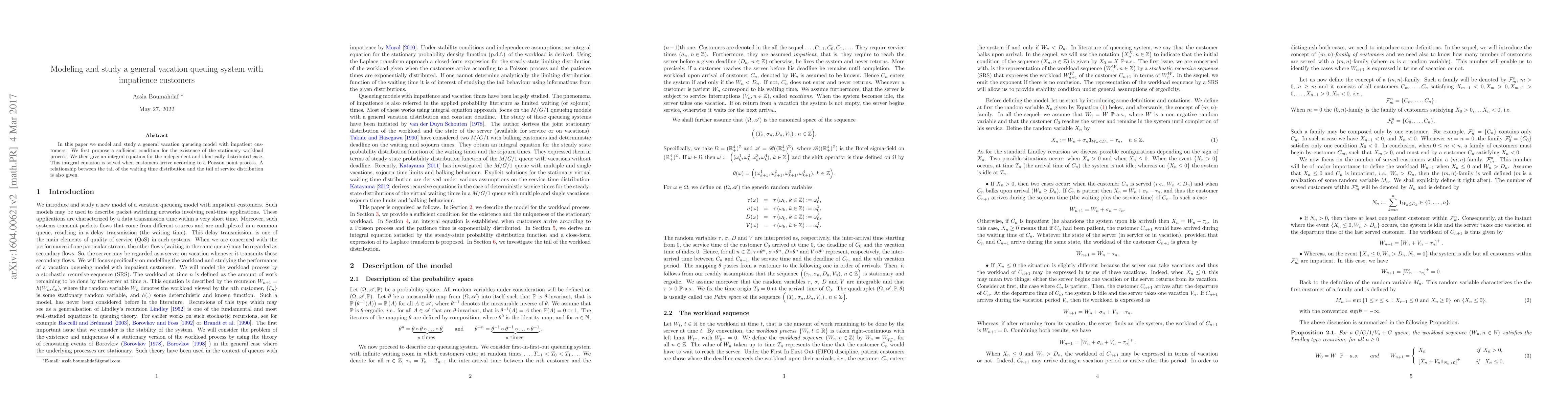 In this paper we models and studies a general vacation queueing model with impatient customers. We first propose a sufficient condition for the existence of the stationary workload process. We then give an integral equation for the independent and identically distributed case. This integral equation is solved when customers arrive according to a Poisson Point process. A relationship between the tail of the waiting time distribution and the tail of service distribution is also given.