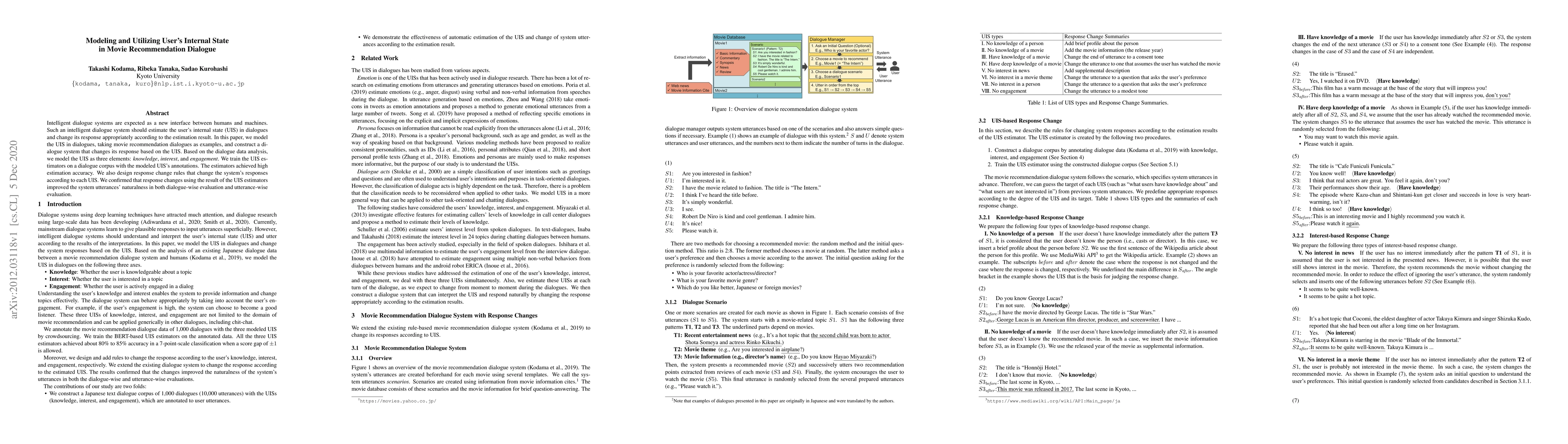 This paper models the user's internal state (UIS) in movie recommendation dialogues, identifying knowledge, interest, and engagement as key elements. The authors develop estimators that accurately predict these states, and demonstrate that adjusting system responses based on UIS estimations enhances the naturalness of dialogue interactions.