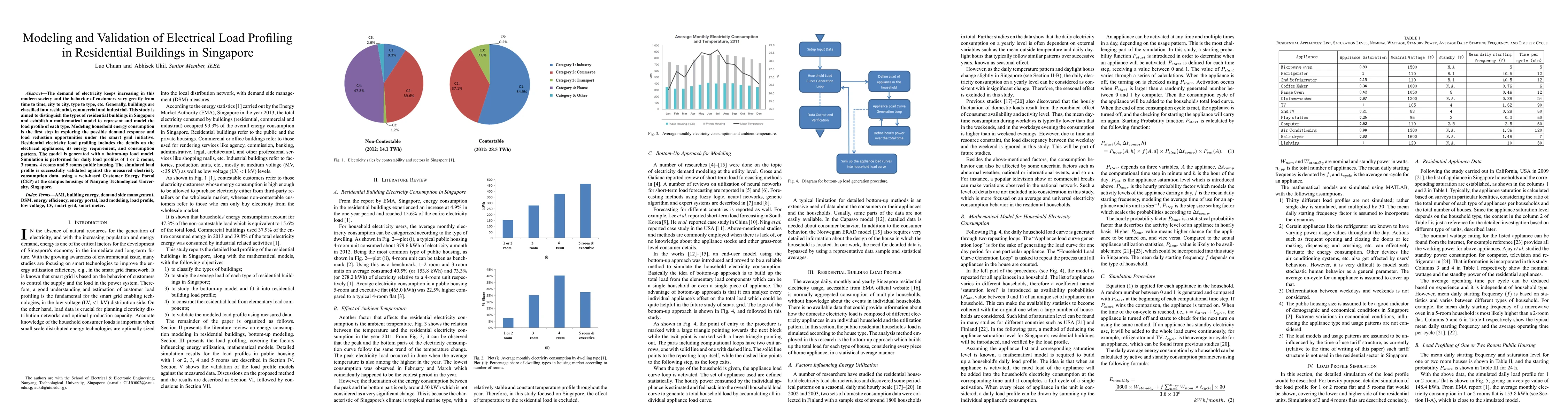 This study develops a mathematical model to represent the electrical load profiles of different residential buildings in Singapore, validated against real consumption data from Nanyang Technological University's campus housing, using a bottom-up load model approach. The model aims to explore demand response and load reduction opportunities under smart grid initiatives.