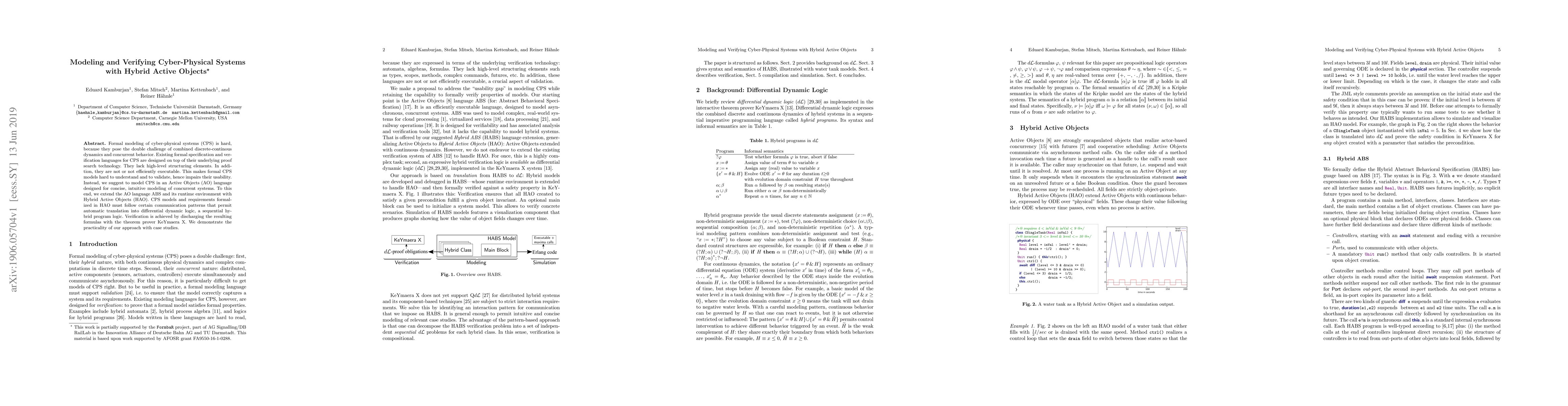 This paper proposes an Active Objects (AO) language extended with Hybrid Active Objects (HAO) to model and verify cyber-physical systems (CPS). The HAO framework allows for intuitive CPS modeling, which is then translated into differential dynamic logic for verification using the KeYmaera X theorem prover, demonstrating practical effectiveness through case studies.