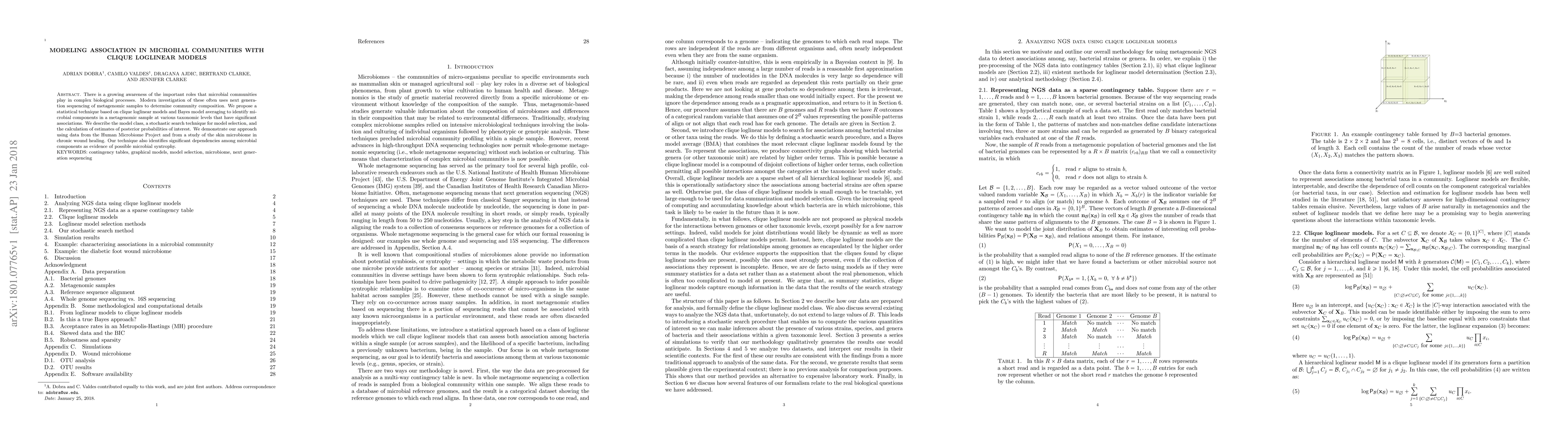 There is a growing awareness of the important roles that microbial communities play in complex biological processes. Modern investigation of these often uses next generation sequencing of metagenomic samples to determine community composition. We propose a statistical technique based on clique loglinear models and Bayes model averaging to identify microbial components in a metagenomic sample at various taxonomic levels that have significant associations. We describe the model class, a stochastic search technique for model selection, and the calculation of estimates of posterior probabilities of interest. We demonstrate our approach using data from the Human Microbiome Project and from a study of the skin microbiome in chronic wound healing. Our technique also identifies significant dependencies among microbial components as evidence of possible microbial syntrophy. KEYWORDS: contingency tables, graphical models, model selection, microbiome, next generation sequencing