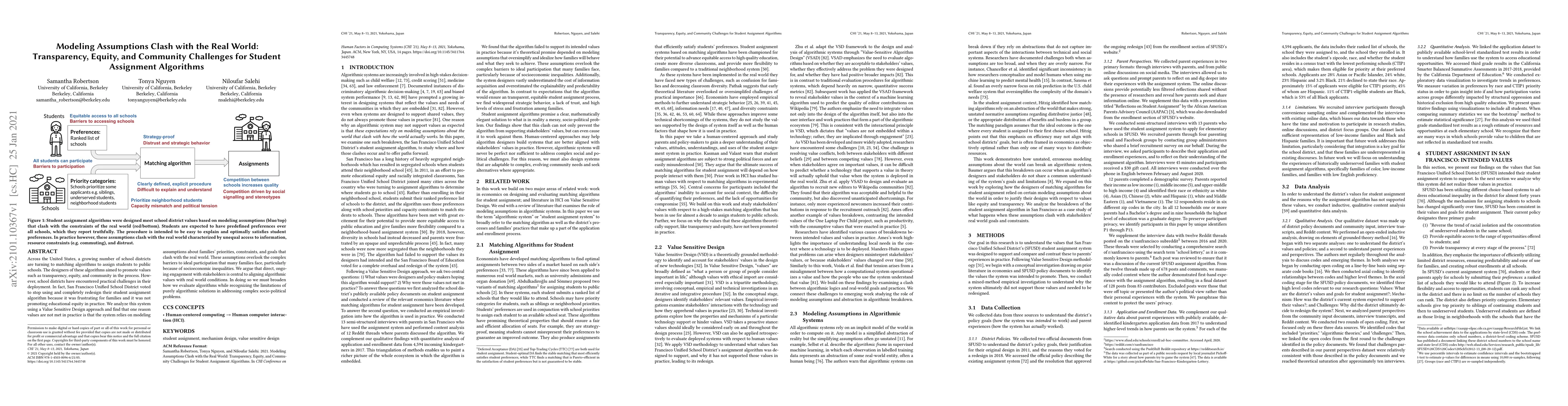 This paper examines the deployment of student assignment algorithms in U.S. school districts, highlighting how modeling assumptions clash with real-world conditions, leading to equity issues. It advocates for stakeholder engagement to better align algorithmic values with practical realities, emphasizing the limitations of purely algorithmic solutions for complex socio-political problems.