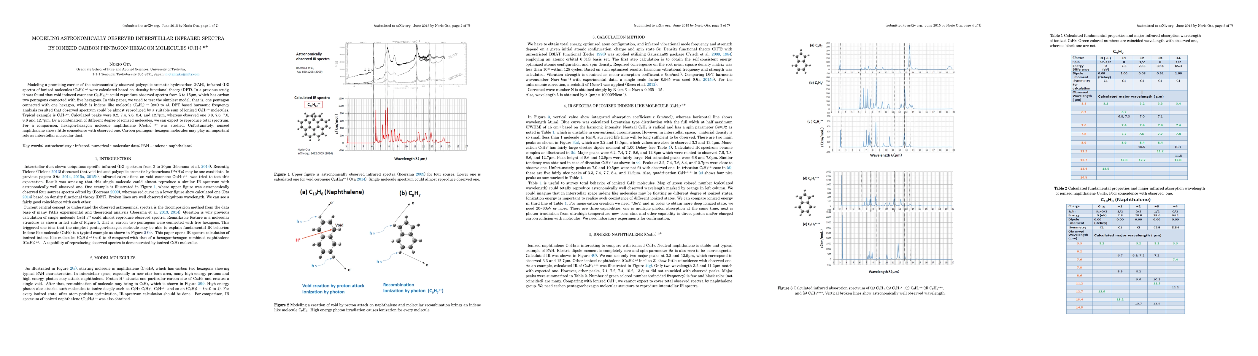 Modeling a promising carrier of the astronomically observed polycyclic aromatic hydrocarbon (PAH), infrared (IR) spectra of ionized molecules (C9H7) n+ were calculated based on density functional theory (DFT). In a previous study, it was found that void induced coronene C23H12++ could reproduce observed spectra from 3 to 15 micron, which has carbon two pentagons connected with five hexagons. In this paper, we tried to test the simplest model, that is, one pentagon connected with one hexagon, which is indene like molecule (C9H7) n+ (n=0 to 4). DFT based harmonic frequency analysis resulted that observed spectrum could be almost reproduced by a suitable sum of ionized C9H7n+ molecules. Typical example is C9H7++. Calculated peaks were 3.2, 7.4, 7.6, 8.4, and 12.7 micron, whereas observed one 3.3, 7.6, 7.8, 8.6 and 12.7 micron. By a combination of different degree of ionized molecules, we can expect to reproduce total spectrum. For a comparison, hexagon-hexagon molecule naphthalene (C10H8) n+ was studied. Unfortunately, ionized naphthalene shows little coincidence with observed one. Carbon pentagon- hexagon molecules may play an important role as interstellar molecular dust.