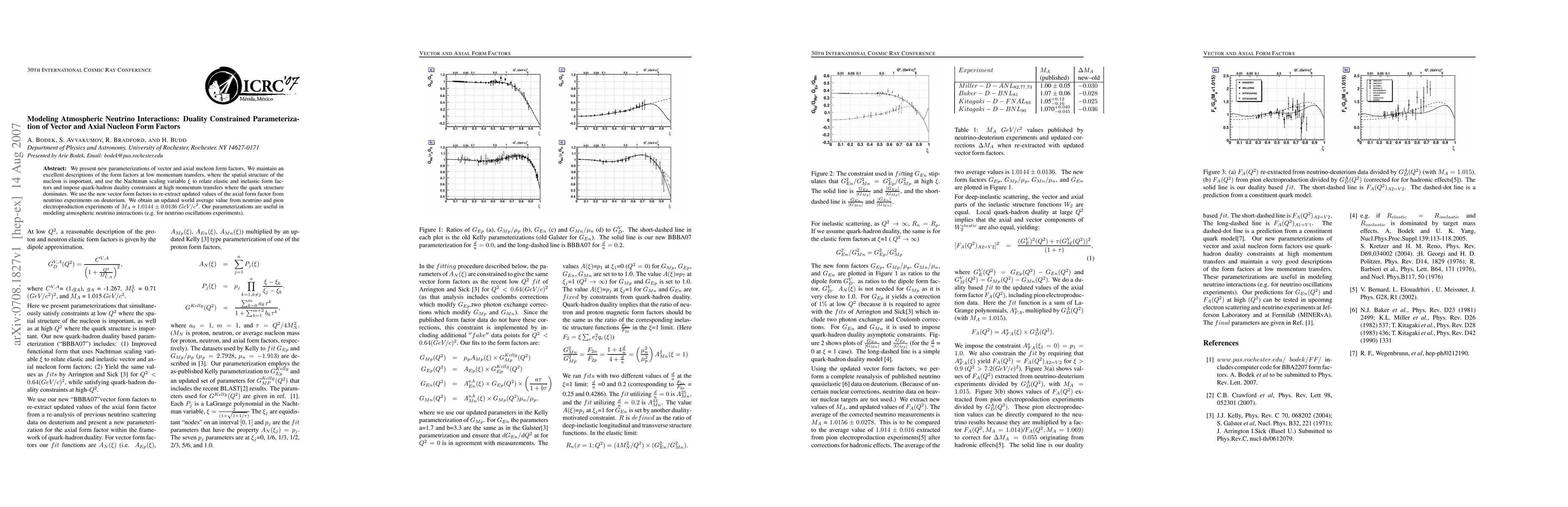 This paper introduces new parameterizations for vector and axial nucleon form factors, maintaining accuracy at low momentum transfers and applying quark-hadron duality at high momentum transfers. The updated parameterizations yield a refined world average value for the axial form factor, enhancing the modeling of atmospheric neutrino interactions.