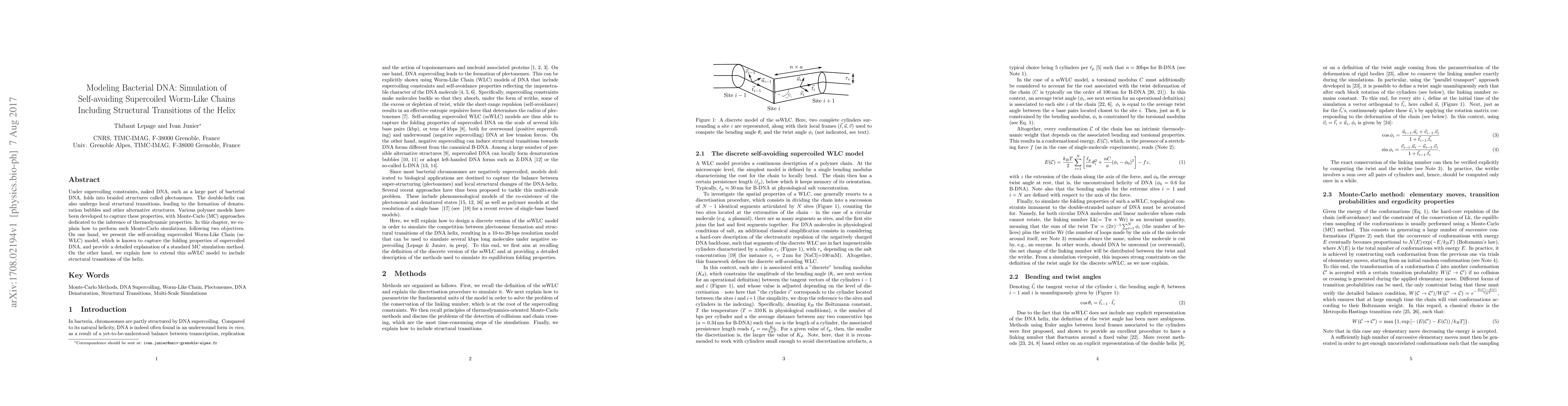 This paper details Monte-Carlo simulations for modeling bacterial DNA under supercoiling, focusing on the self-avoiding supercoiled Worm-Like Chain (ssWLC) model. It also extends the ssWLC model to incorporate helix structural transitions, including denaturation bubbles and alternative structures.